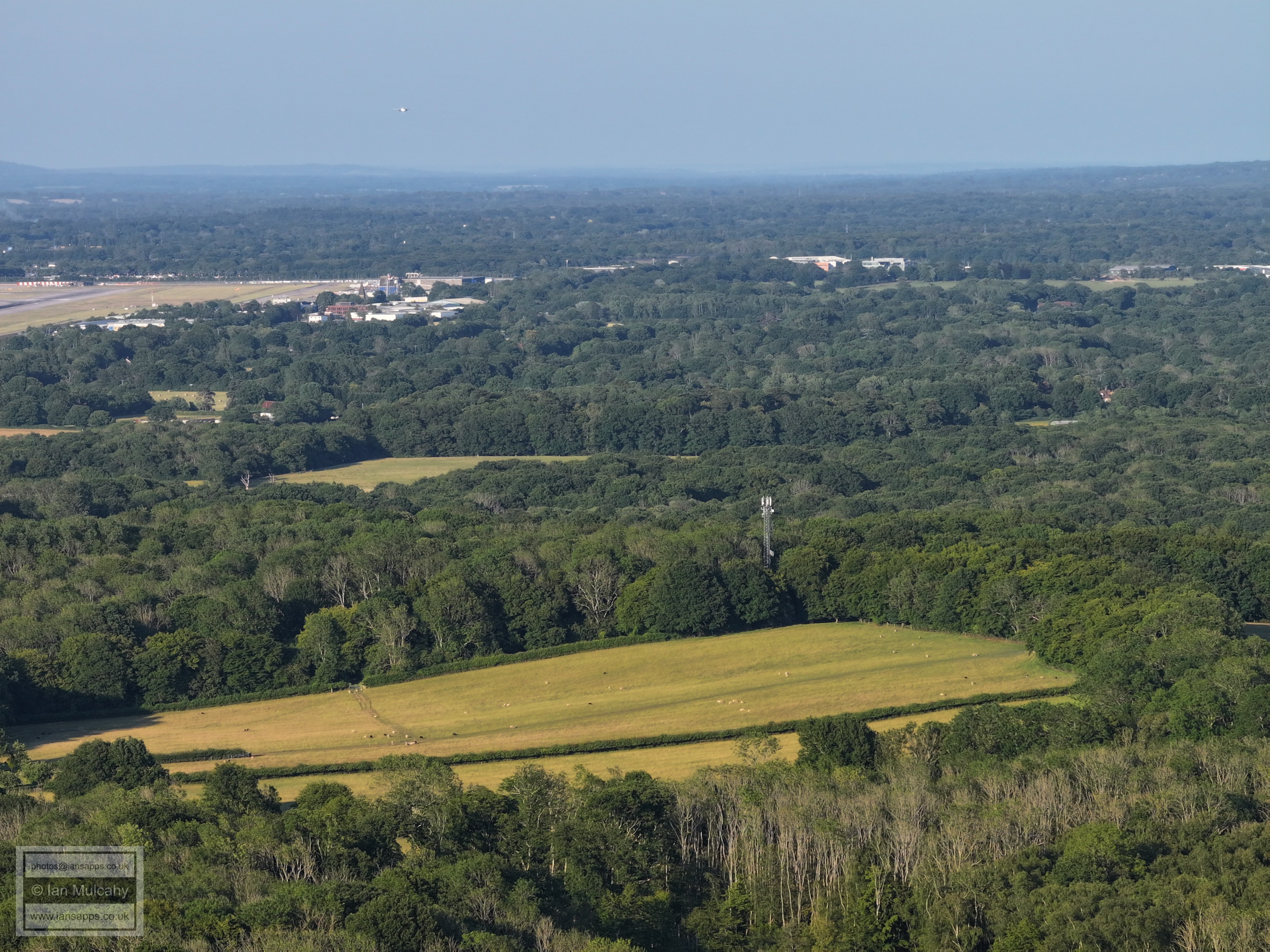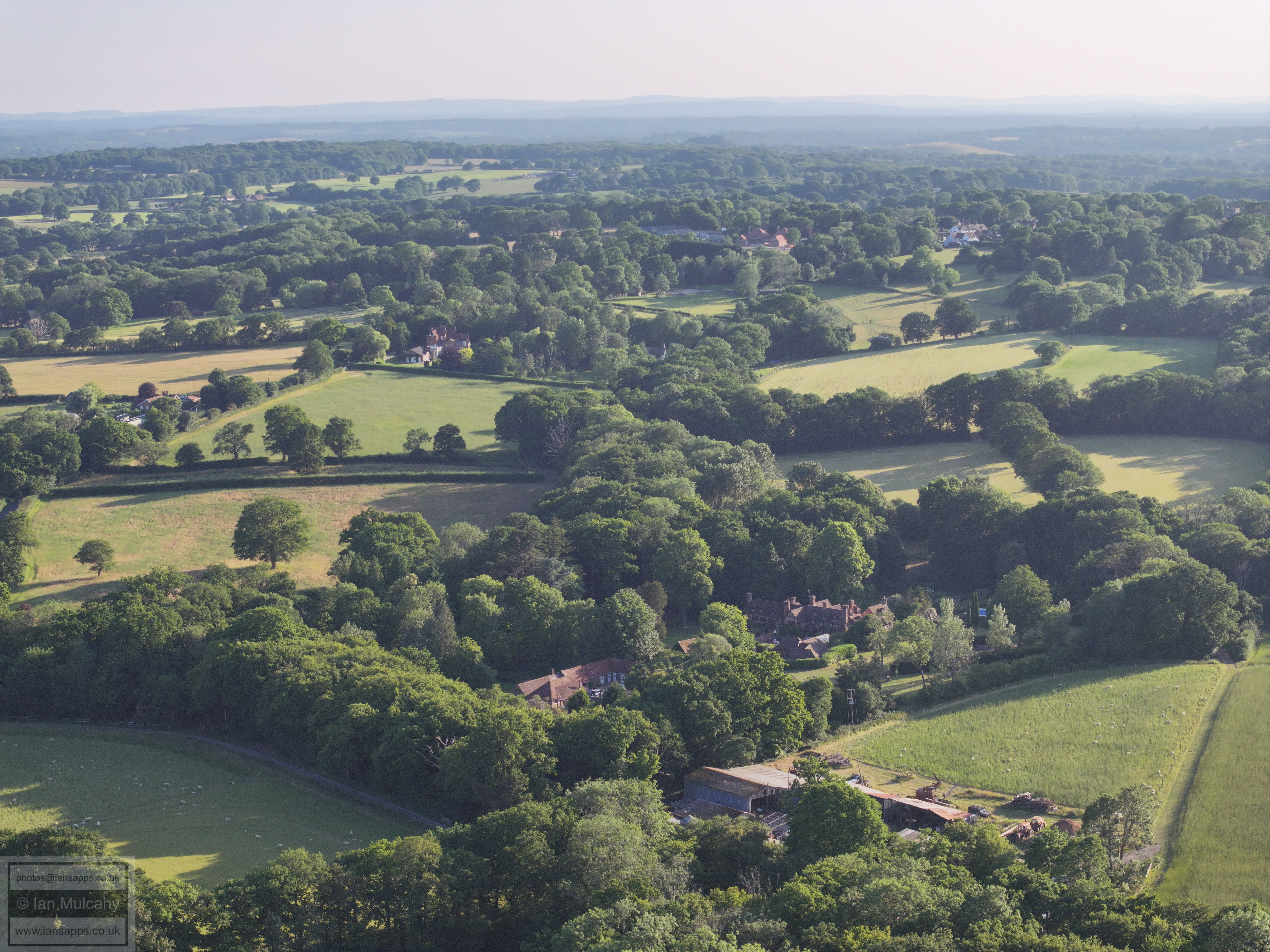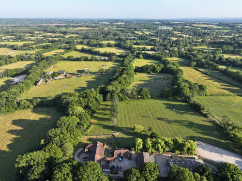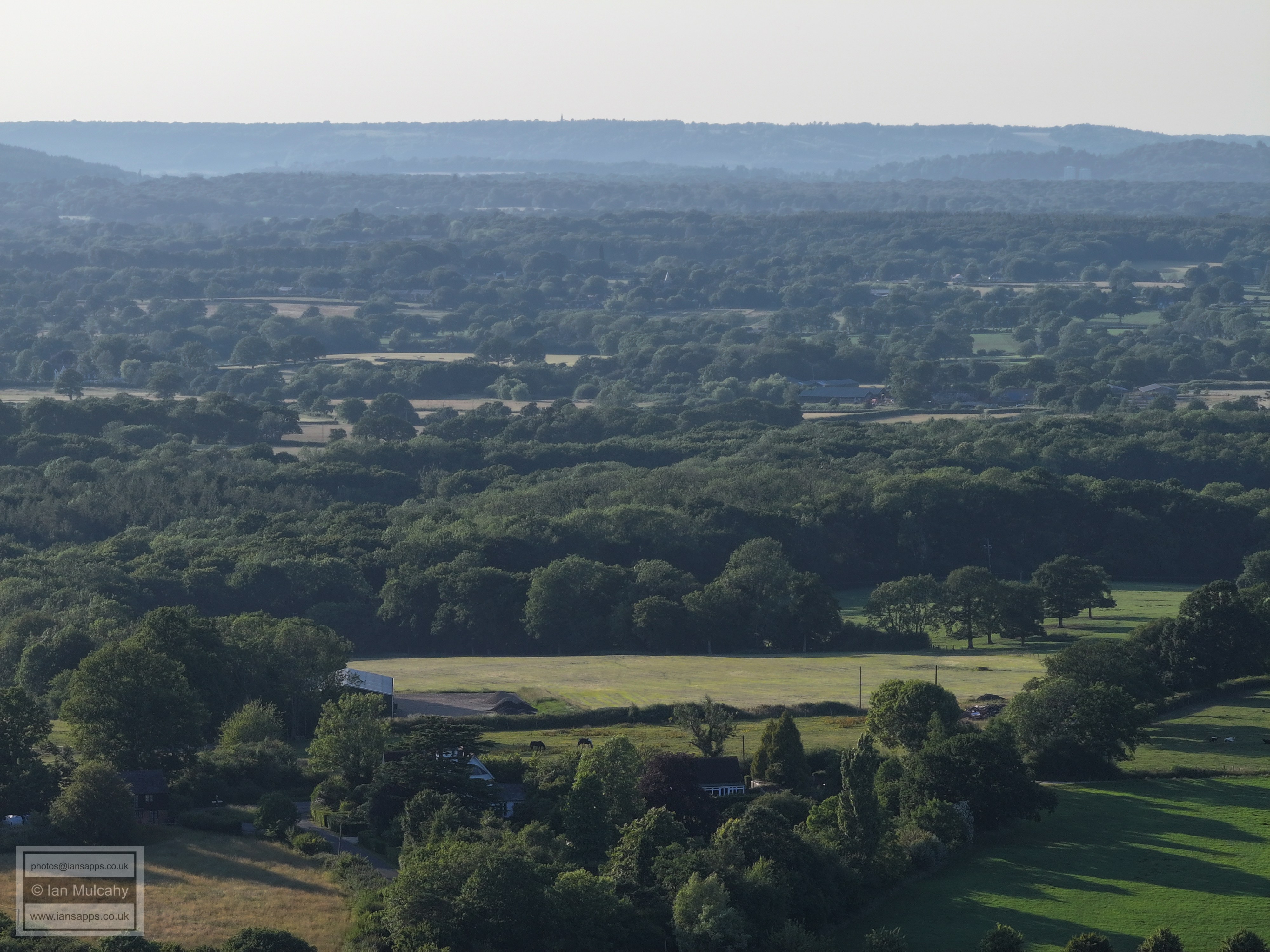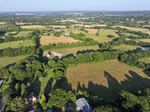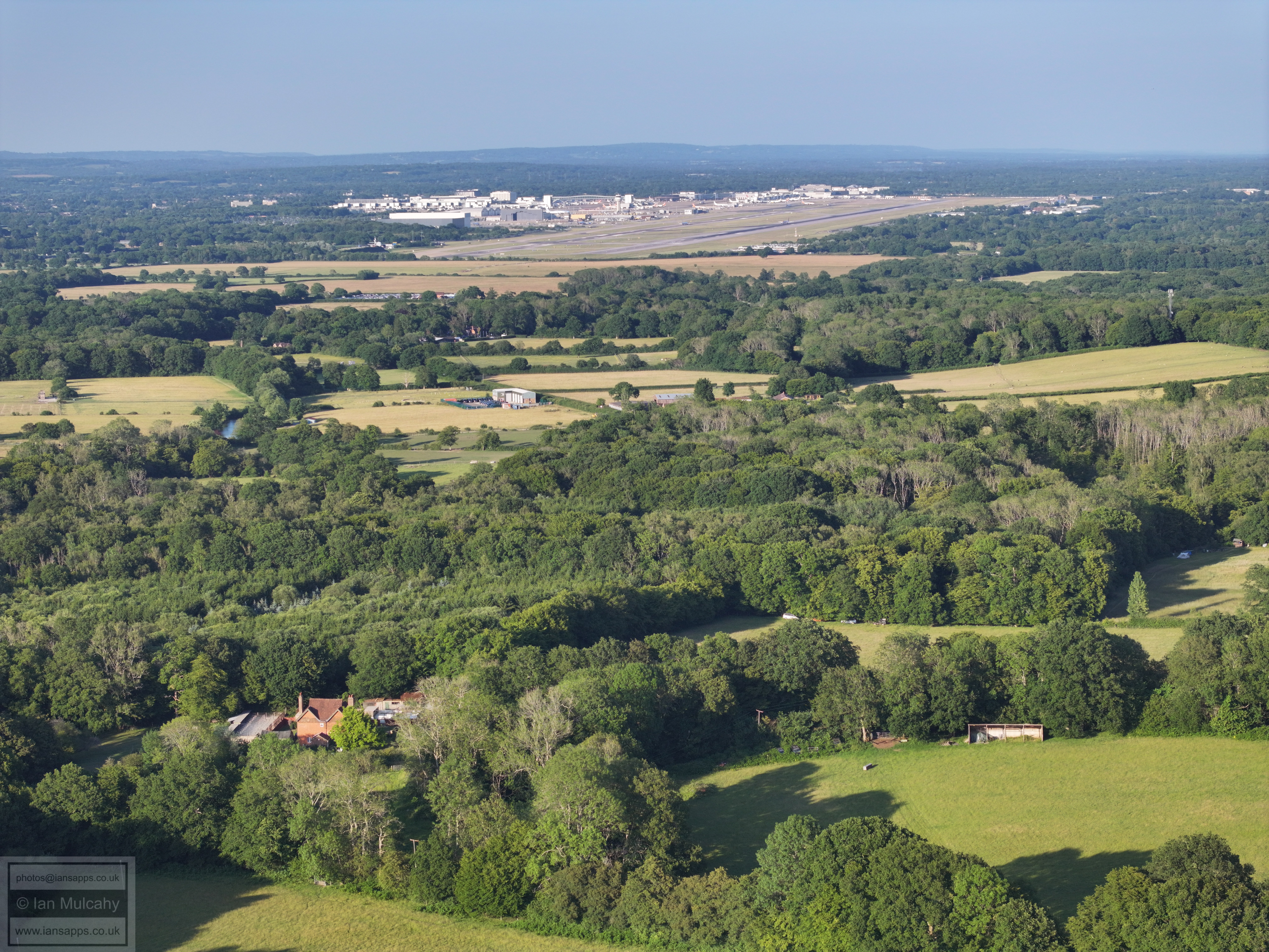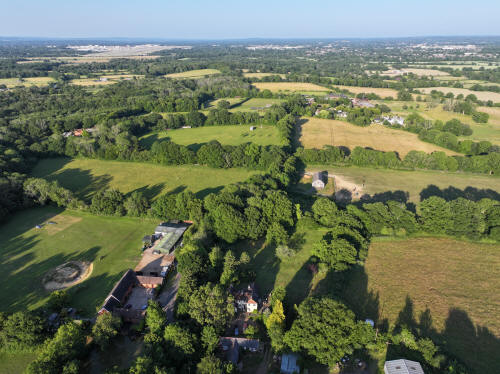 61 aerial photographs, of varying focal lengths, taken behind from a field west of Langhurst Lane close to Peters Farm in Rusper, West Sussex on the evening of 18 June 2025. I have annotated some of the photos.
