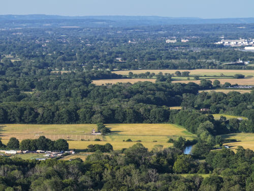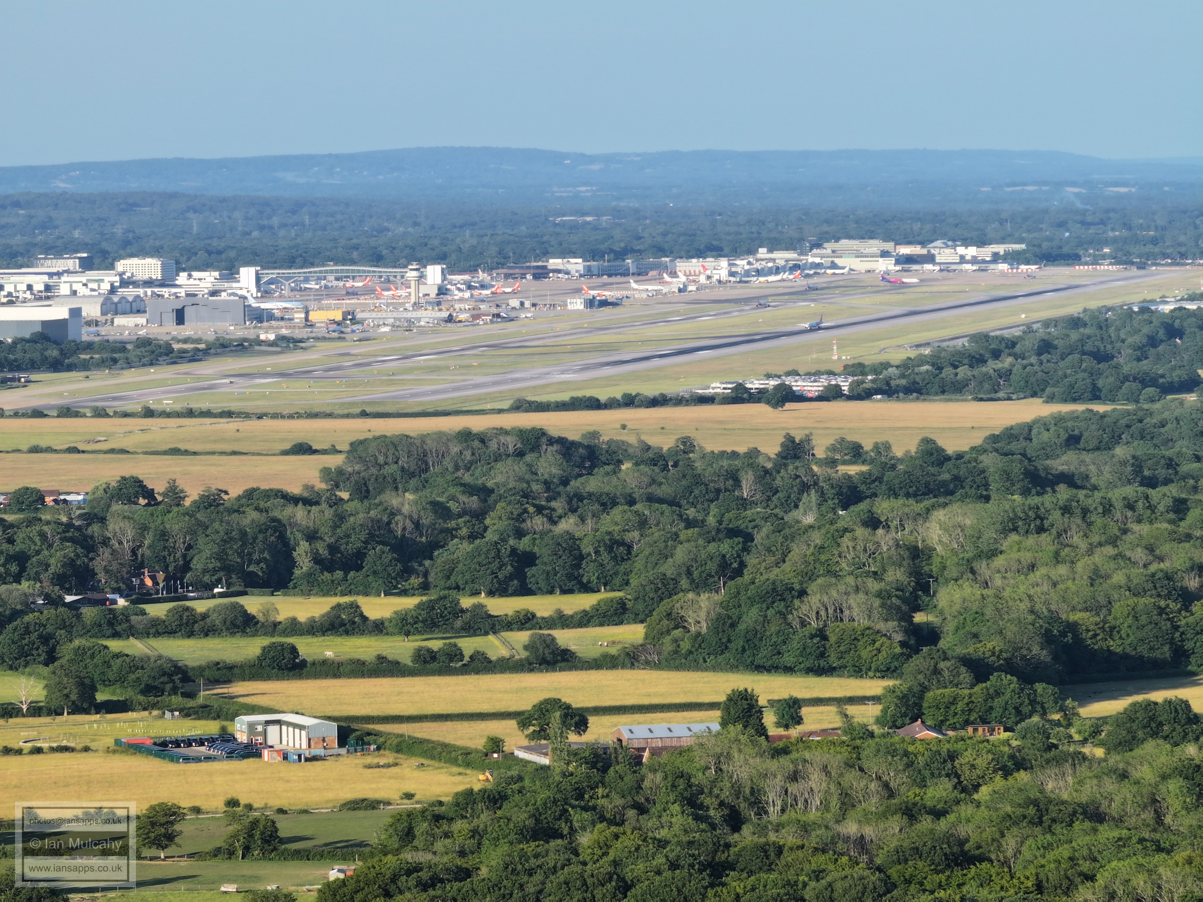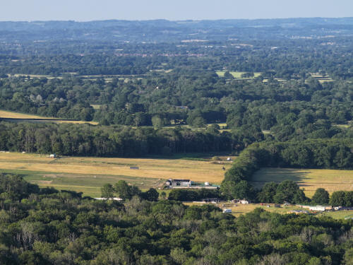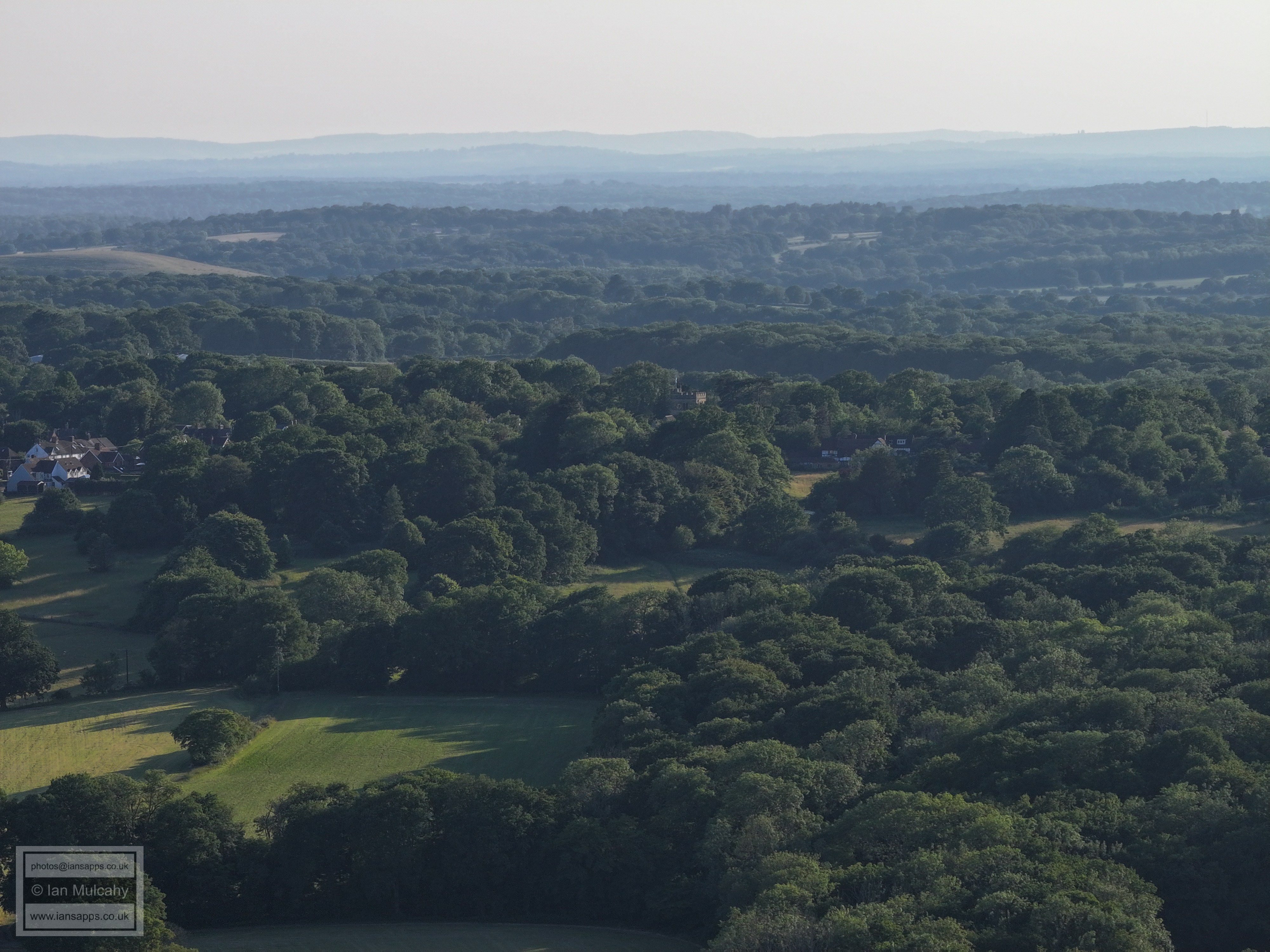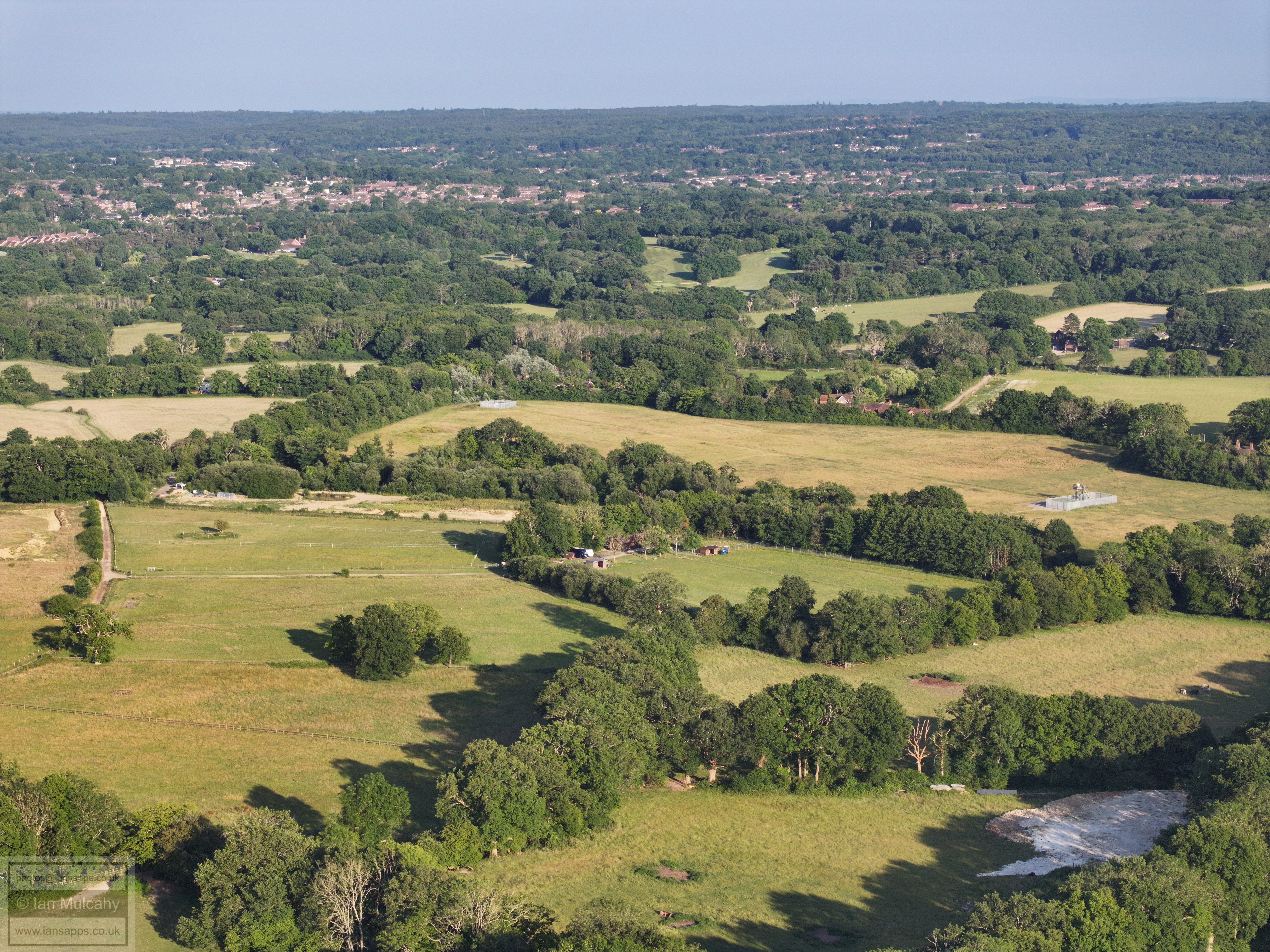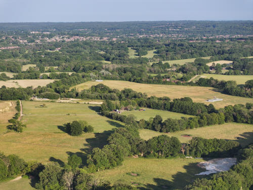 61 aerial photographs, of varying focal lengths, taken behind from a field west of Langhurst Lane close to Peters Farm in Rusper, West Sussex on the evening of 18 June 2025. I have annotated some of the photos.