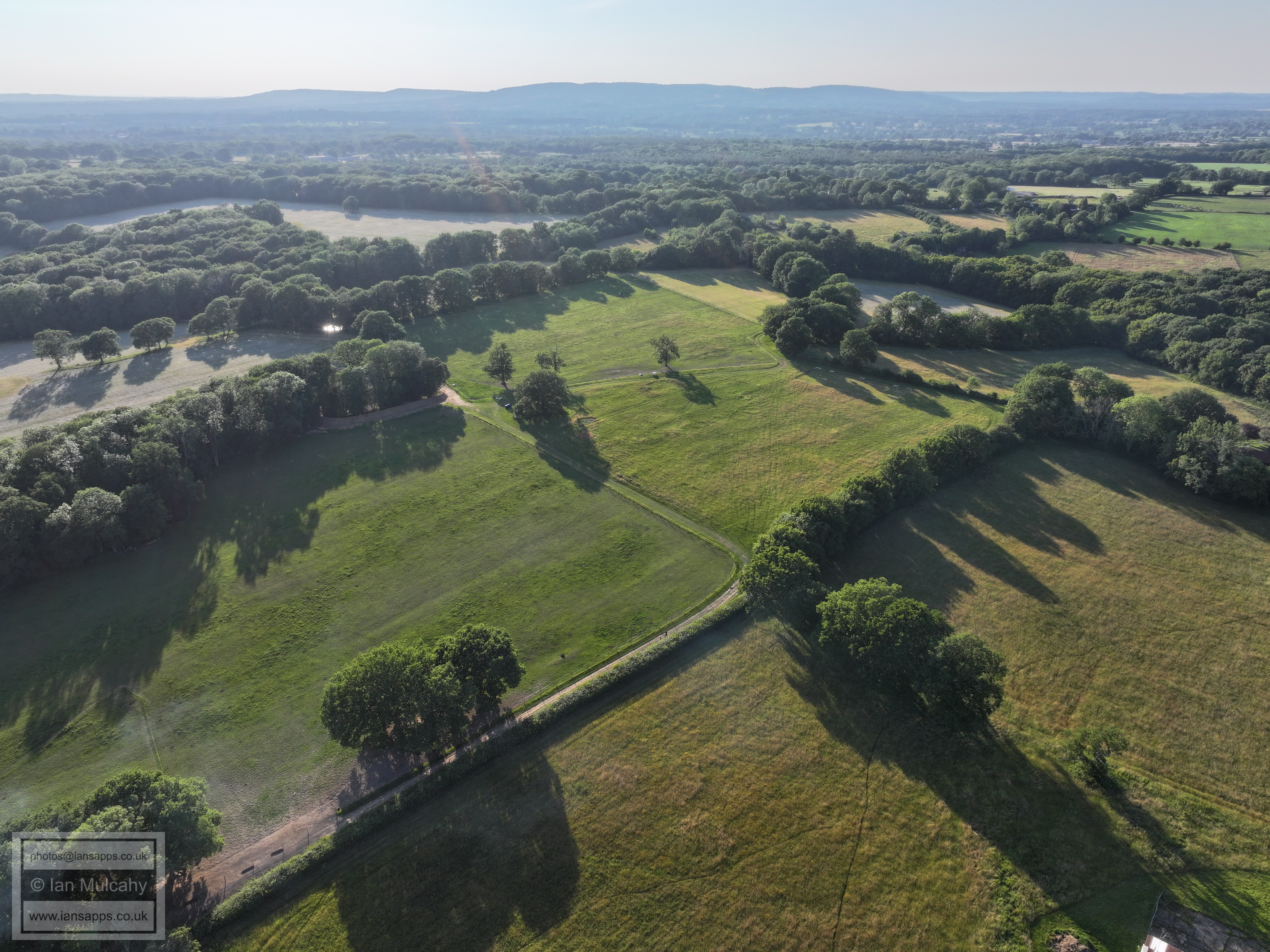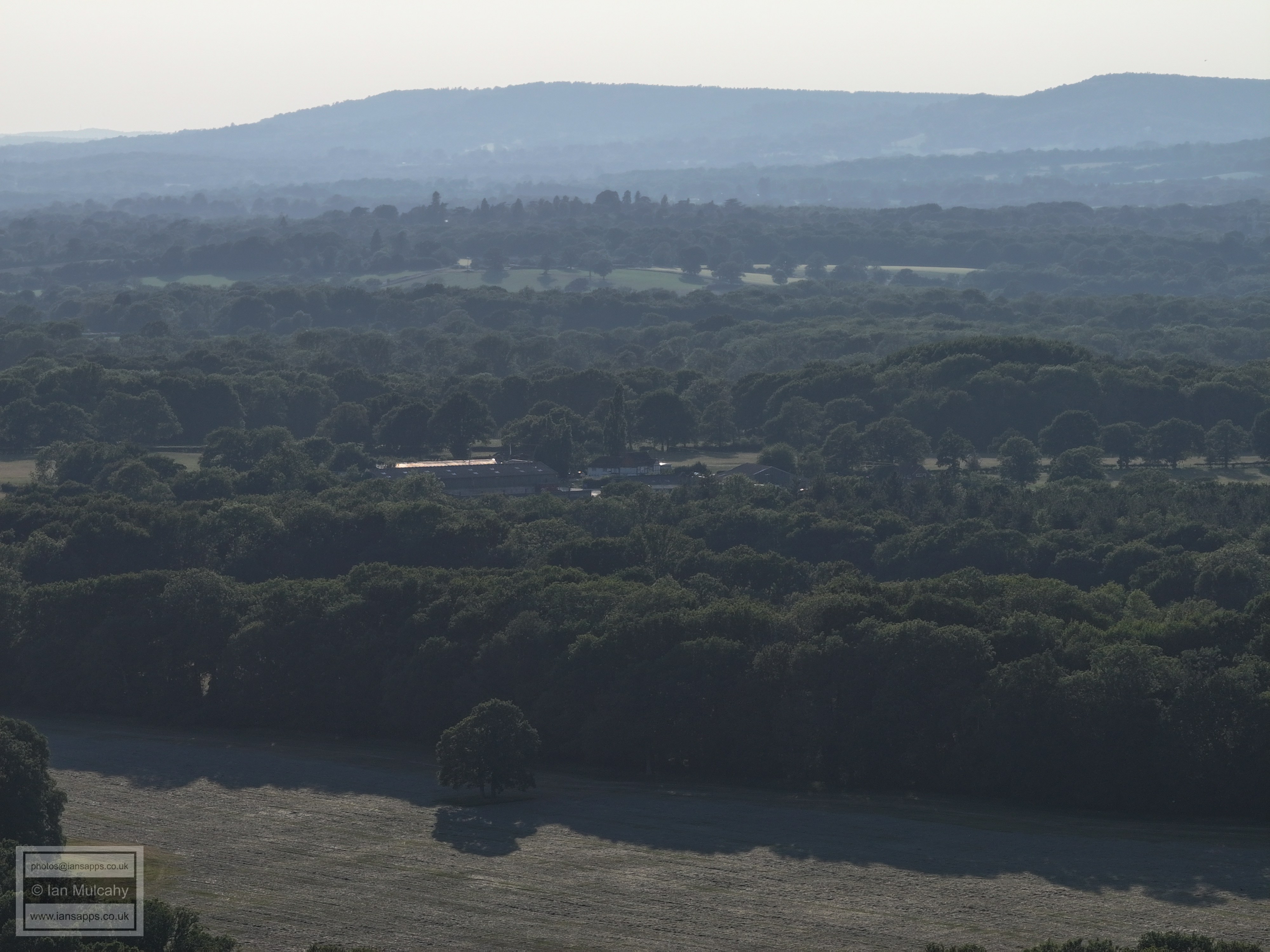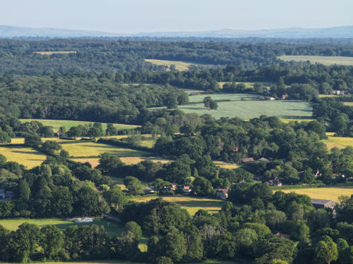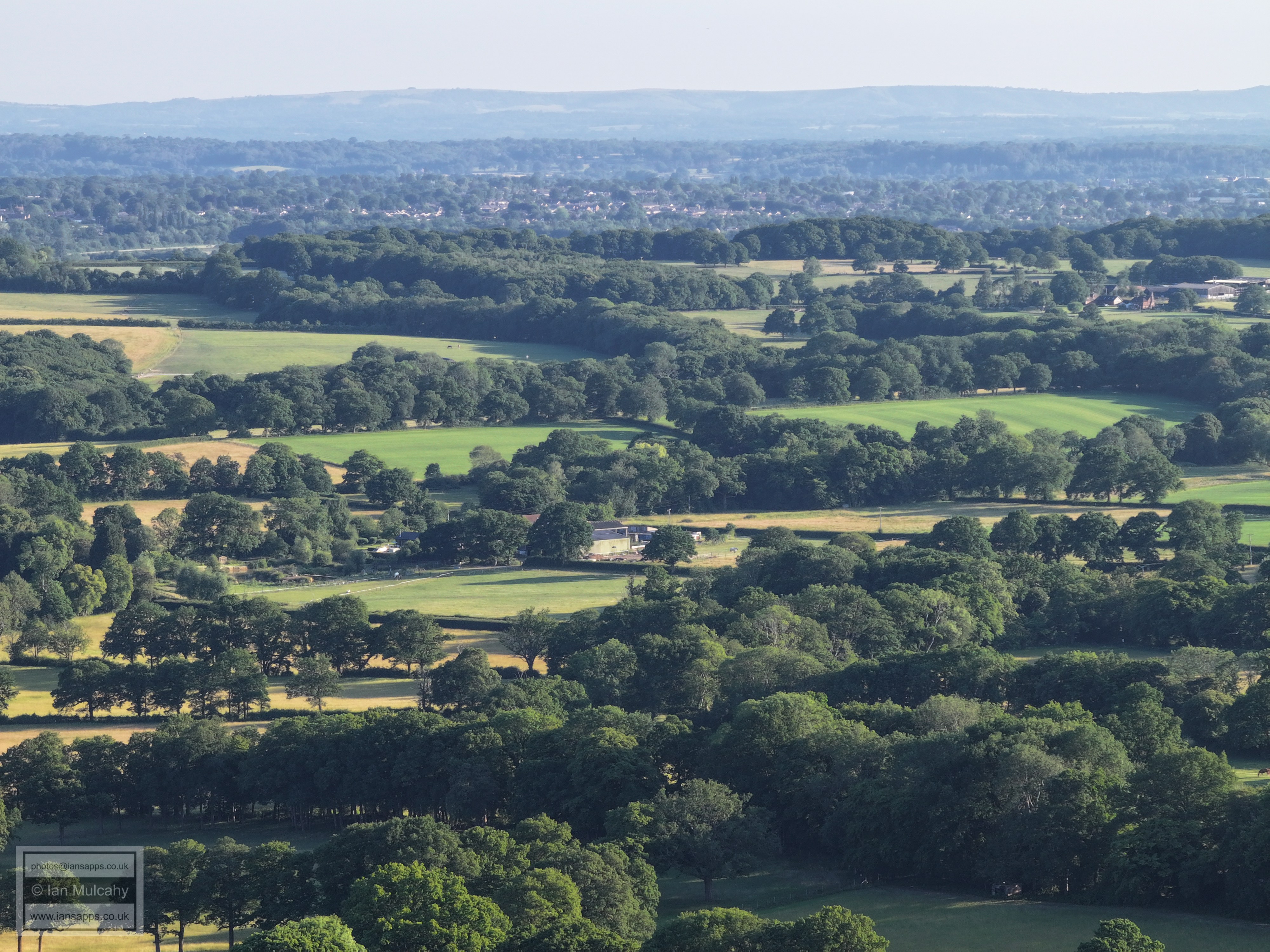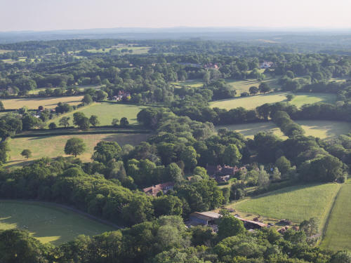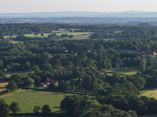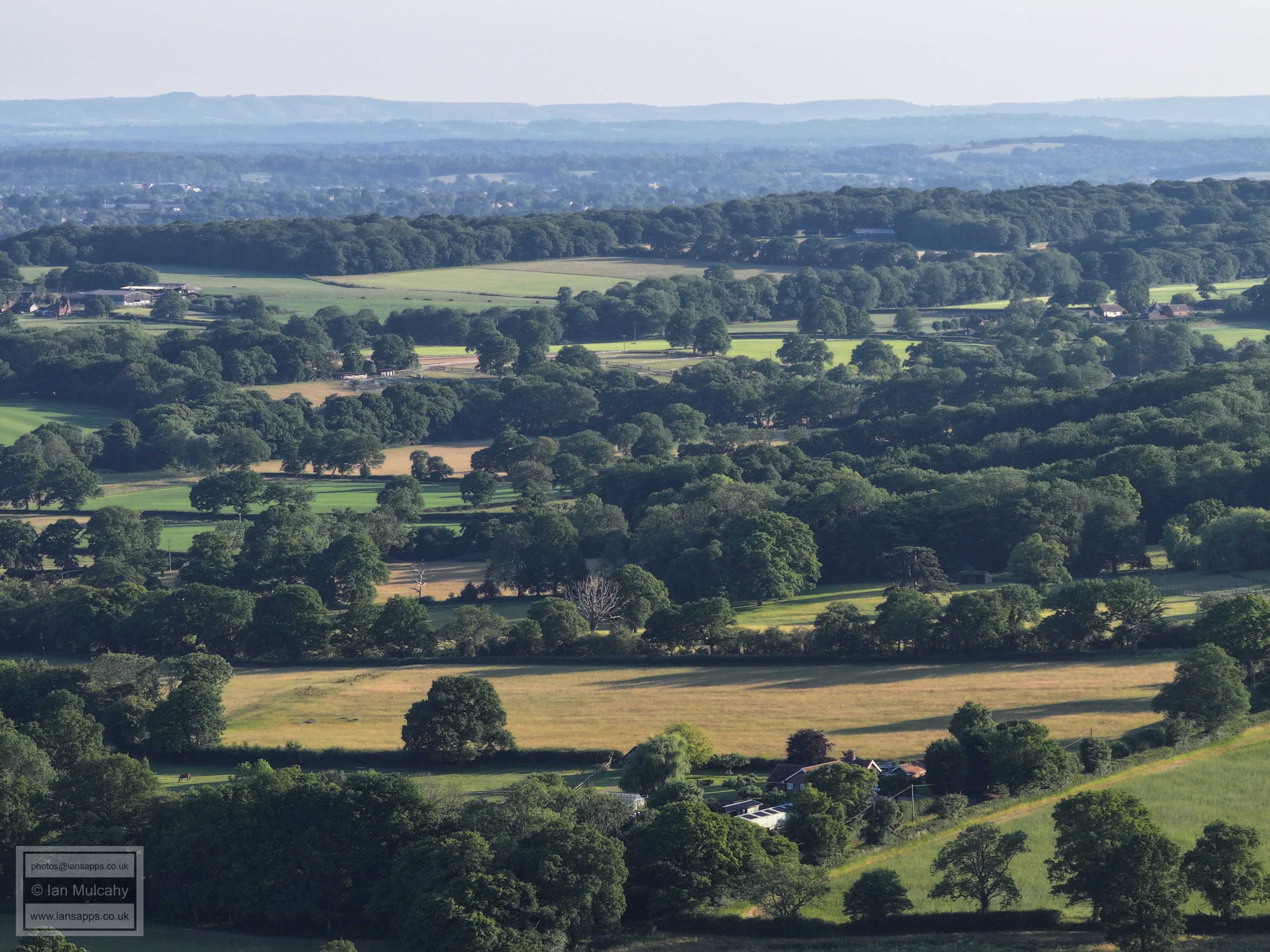 61 aerial photographs, of varying focal lengths, taken behind from a field west of Langhurst Lane close to Peters Farm in Rusper, West Sussex on the evening of 18 June 2025. I have annotated some of the photos.