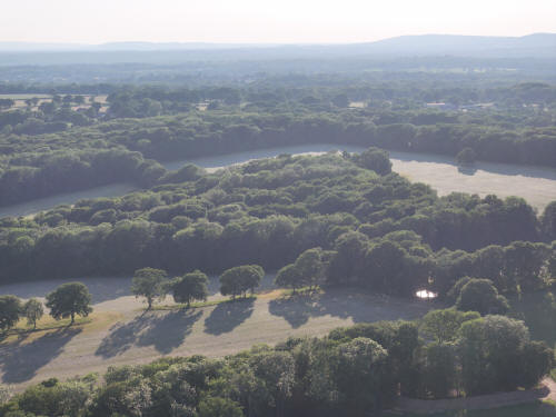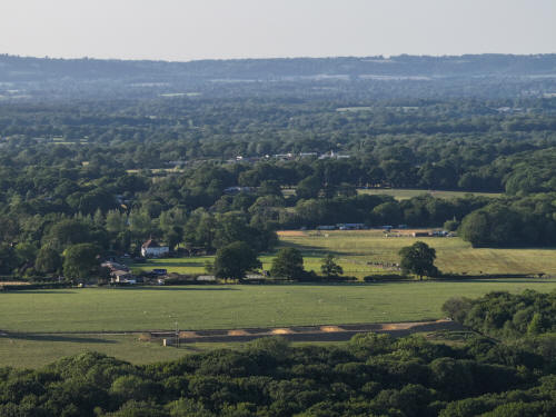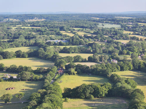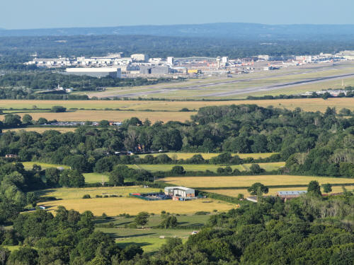 The fields of Kilnwood and Stumbleholm Farms fill the bottom two thirds of the photo with Kilnwood Vale above. Just below Kilnwood Vale, a little left of centre, is Upper Bewbush farm. Cottesmore Golf Club is above.