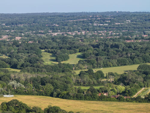 Ifield Golf Course in the centre. The drive to Stumbleholm Farm is bottom right. Bewbush & Broadfield are beyond. Slaugham Water Tower is on top of the ridge in the top right quarter.