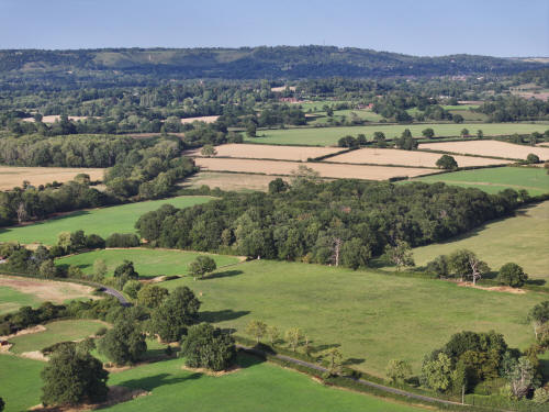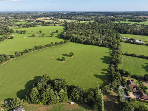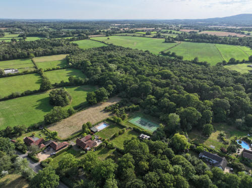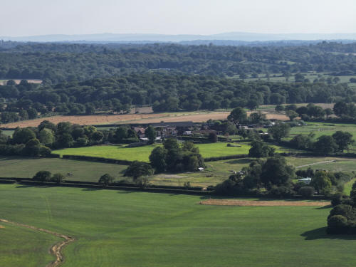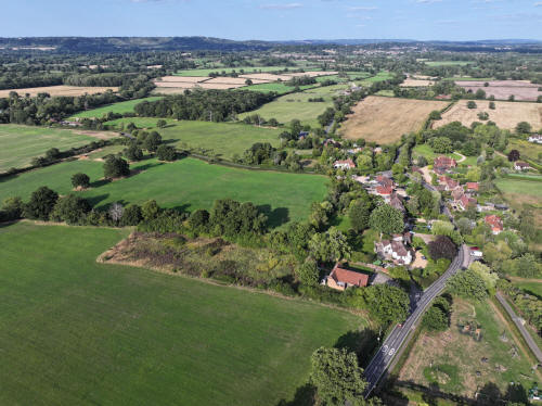 The hedge lined road running left to right about a third of the way up the picture is Shellwood Road, and the buildings in the centre are at Shellwood Manor