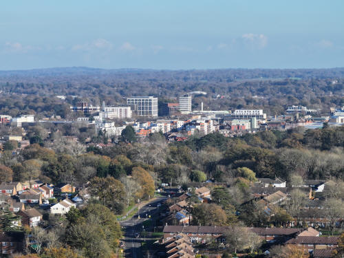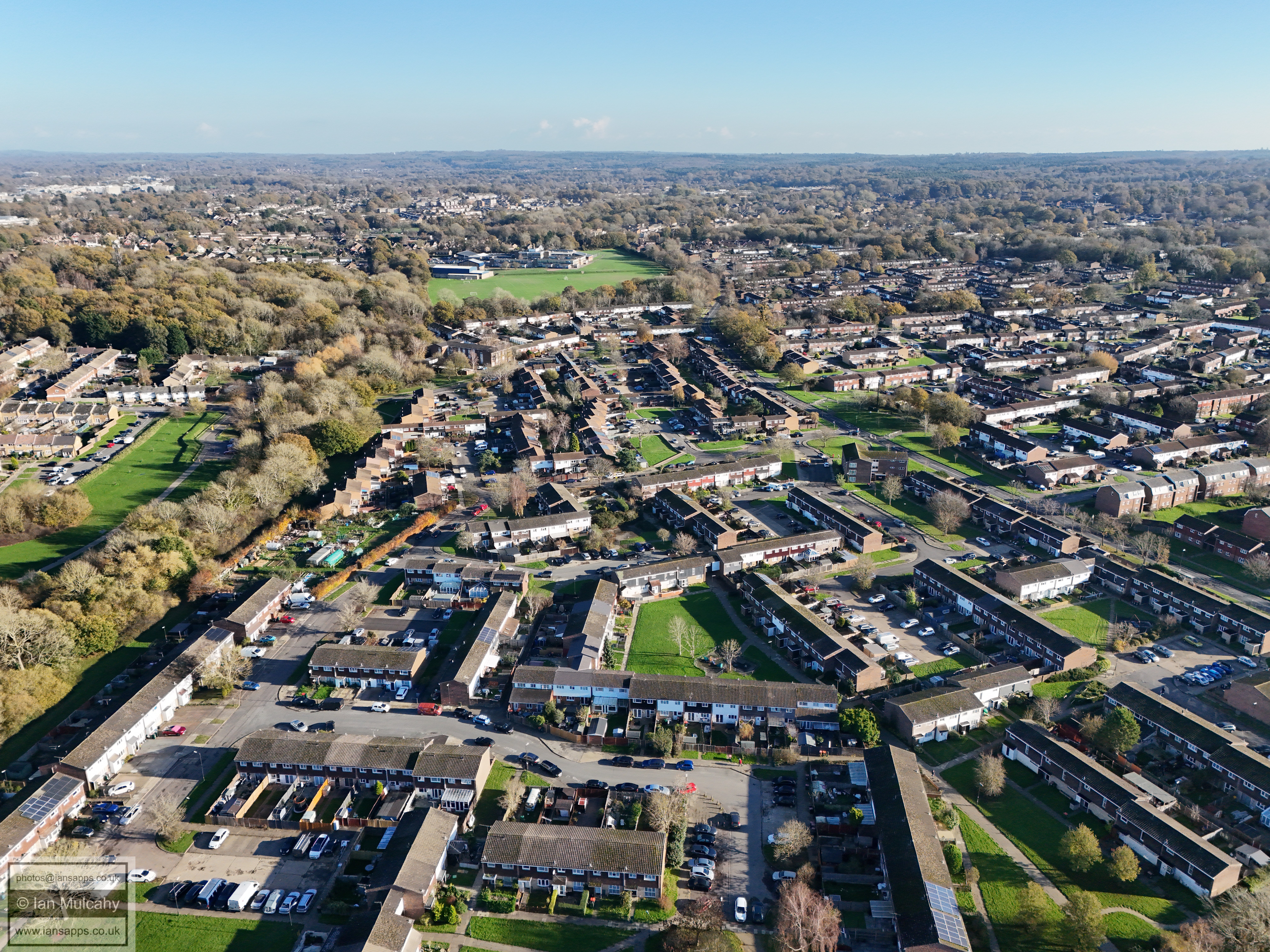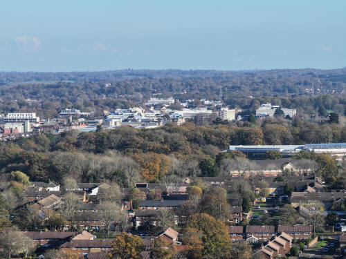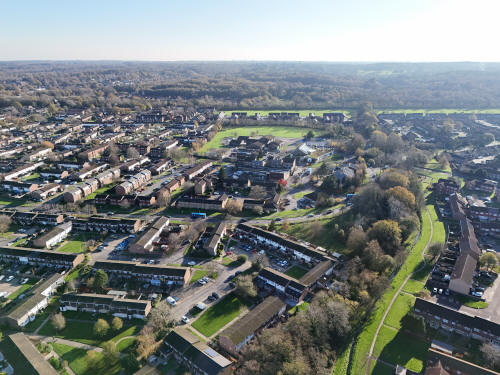 Bewbush West (left) and Ifield West (right) Kilnwood Ridge, House Copse and Hyde Hill Woods are beyond.