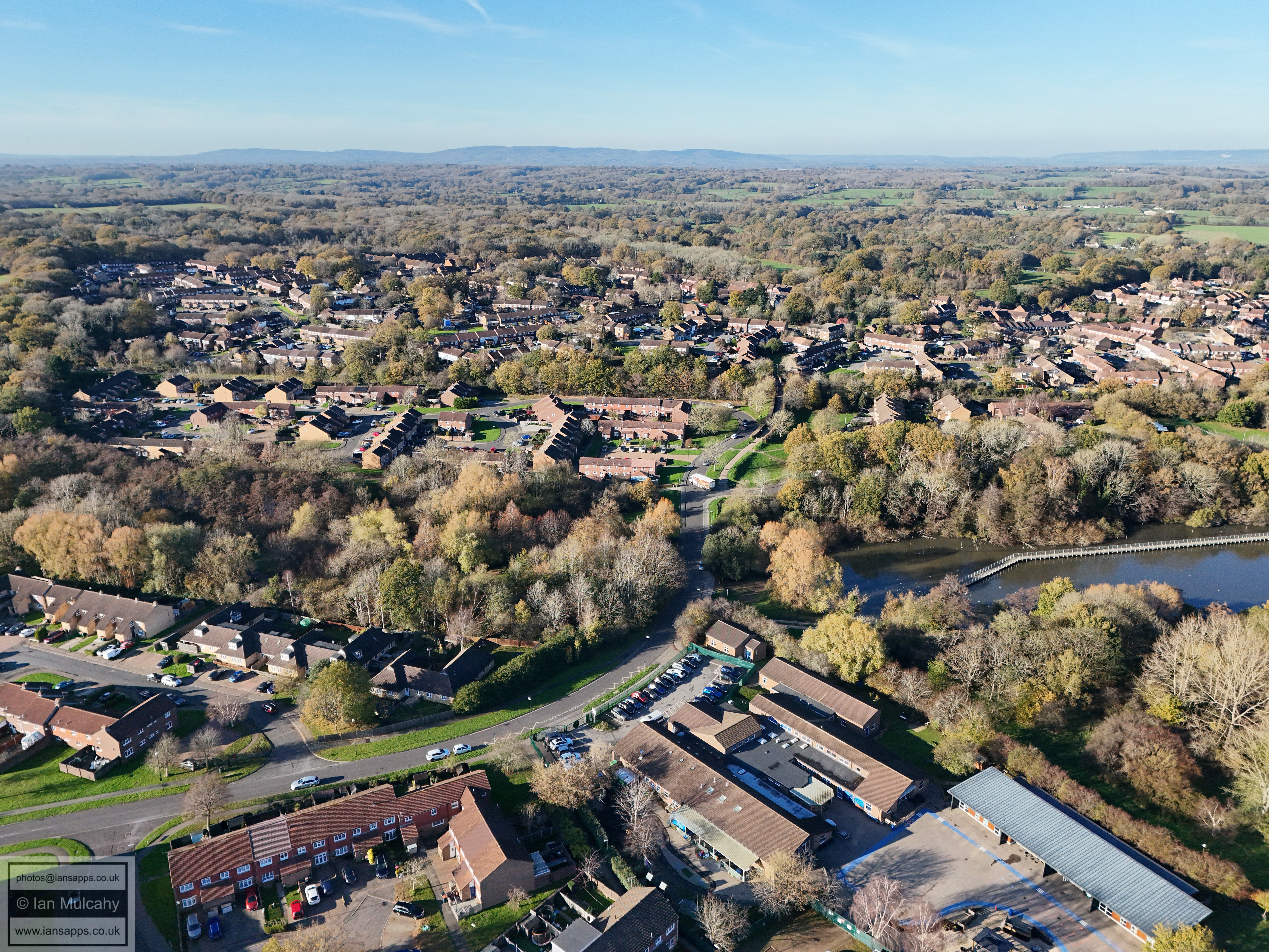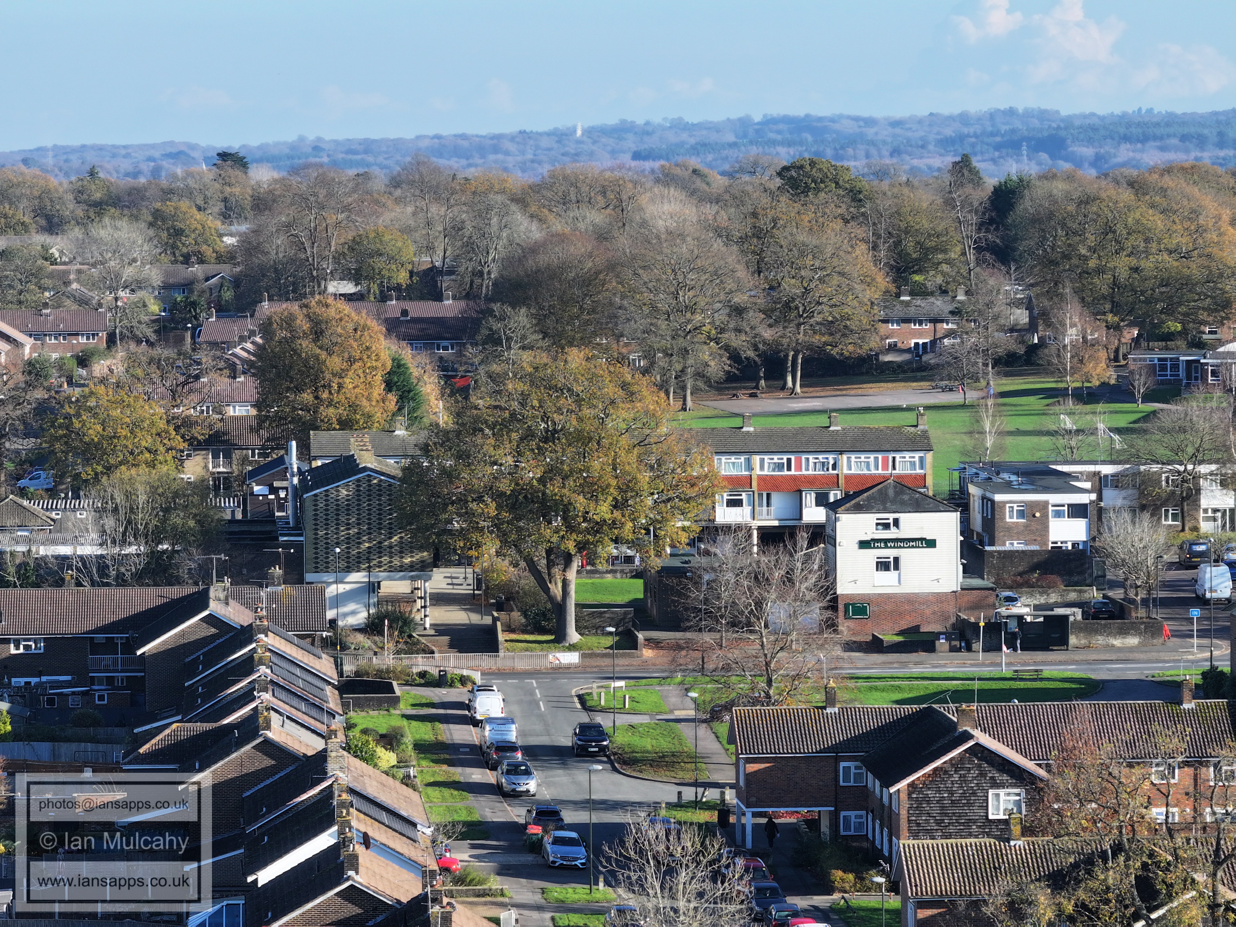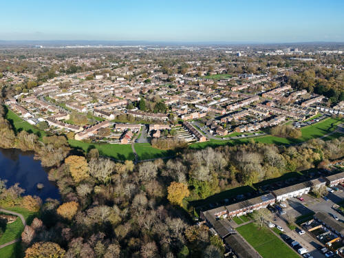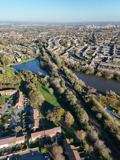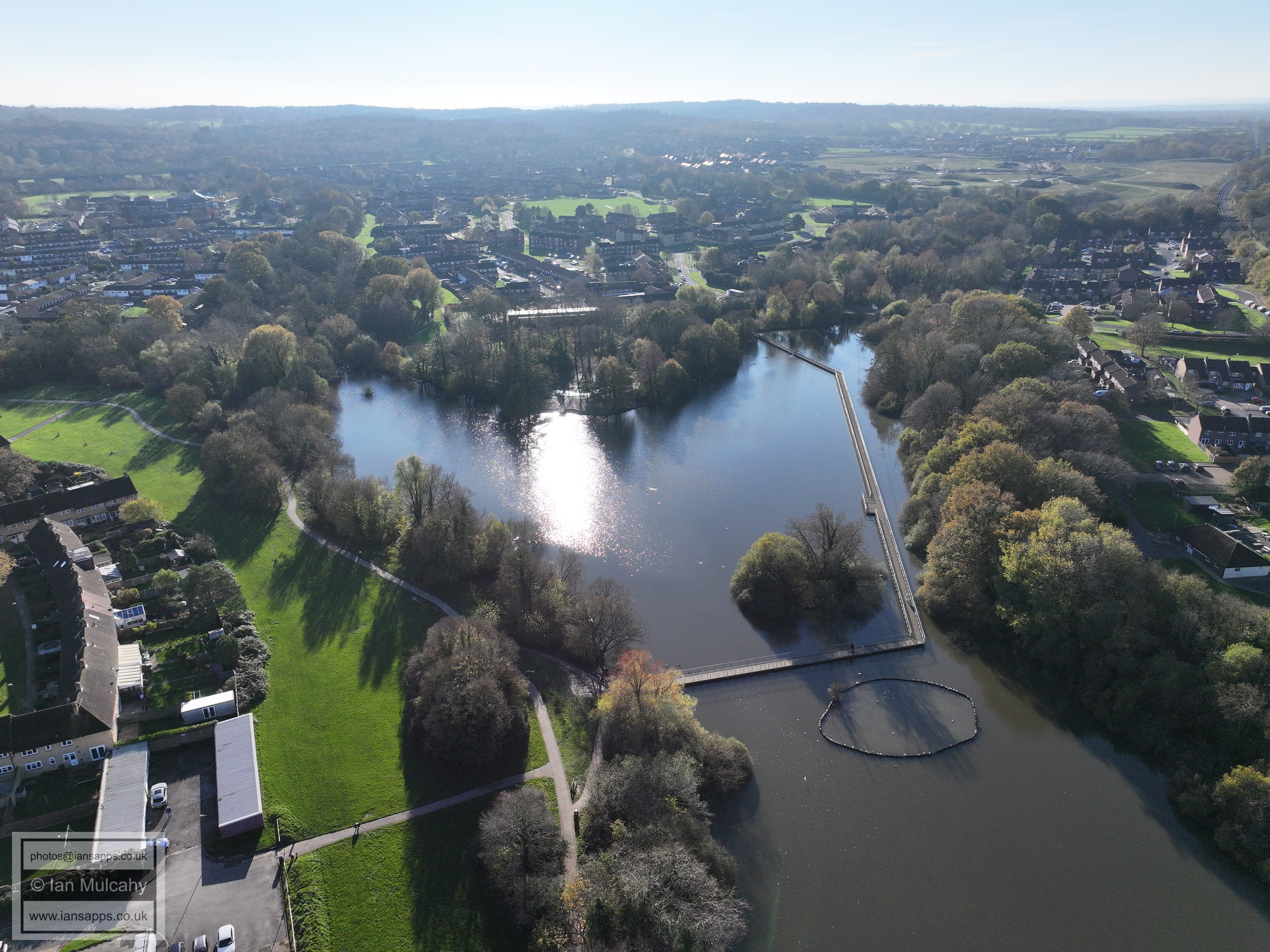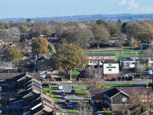 A small set of 25 aerial images of varying focal length taken in the Millpond area on 21 November 2025. Photos are from the path leading to the pond from Lea Close in Gossops Green, the path beside the Dowster Brook behind Hawksmoor Road in Bewbush and in Hanbury Road in Ifield West. I have annotated some of the photos.
