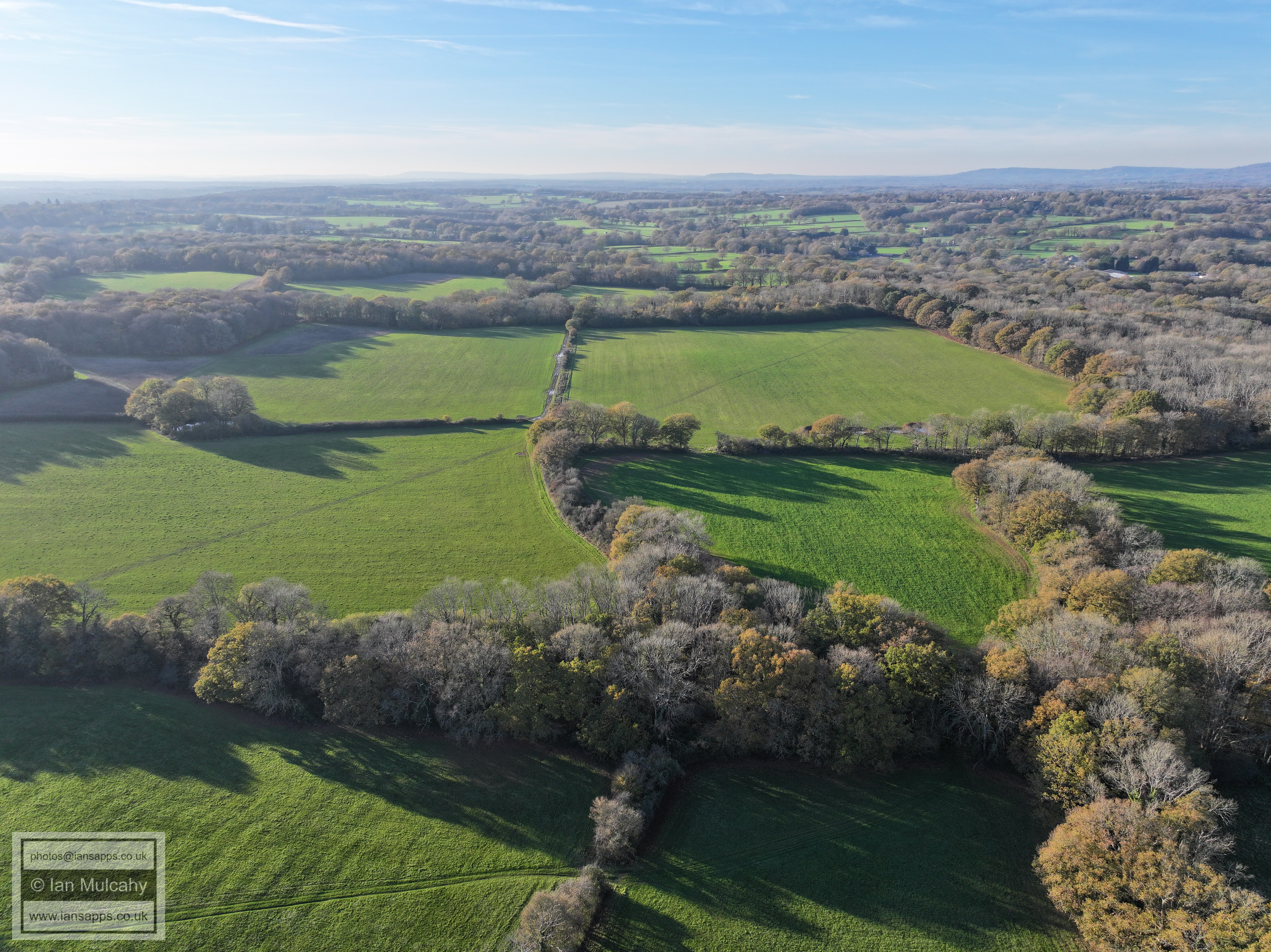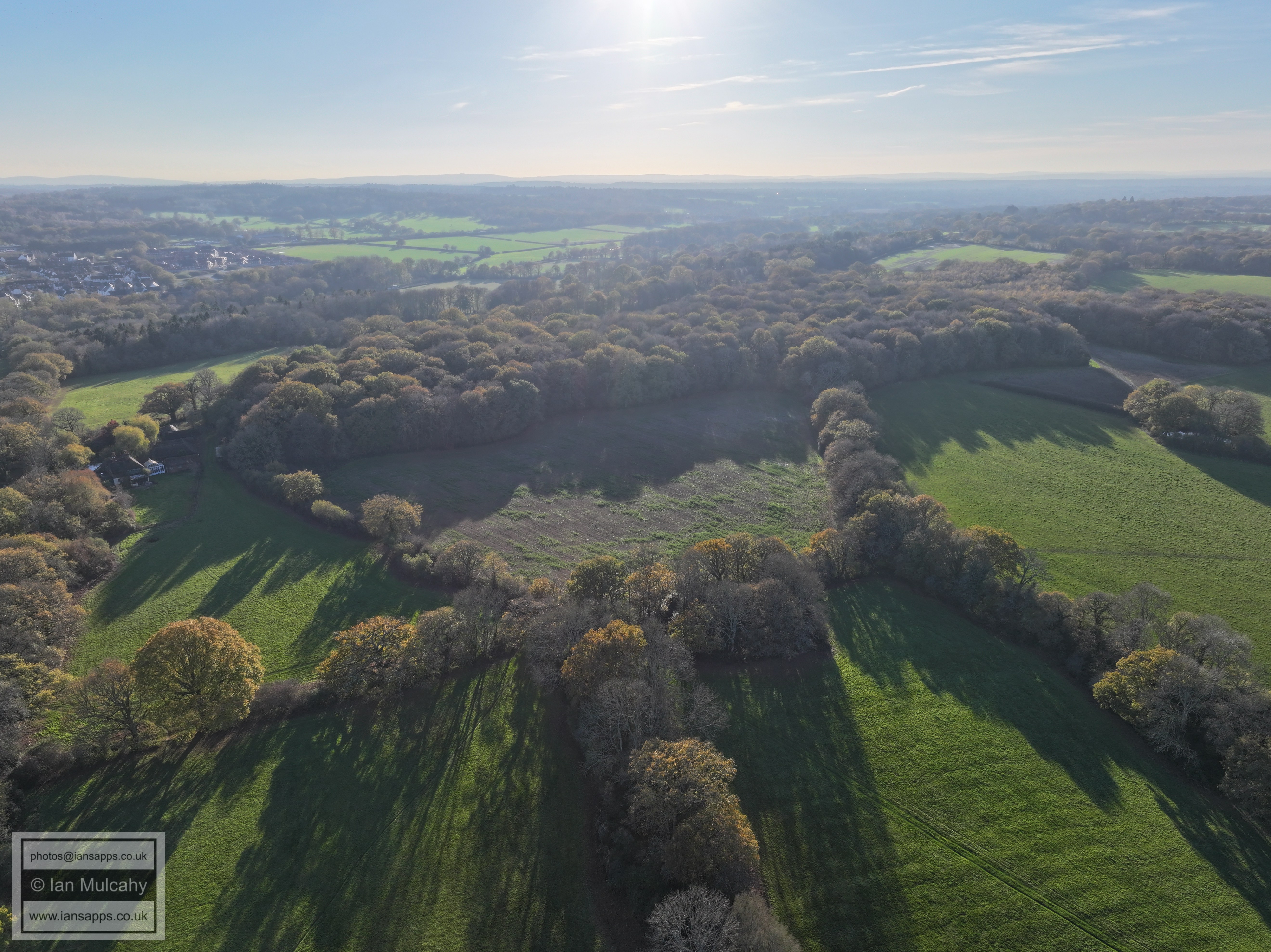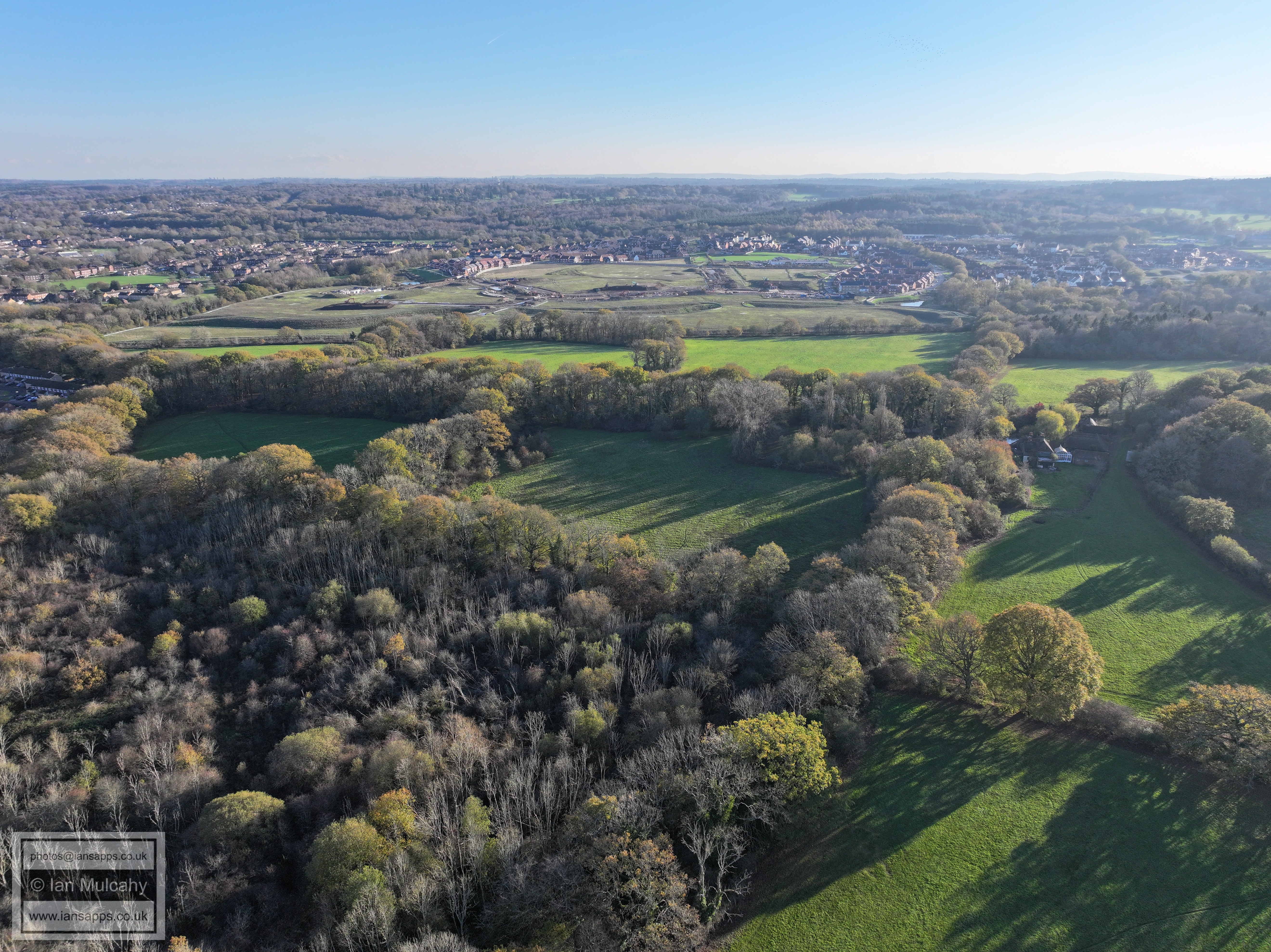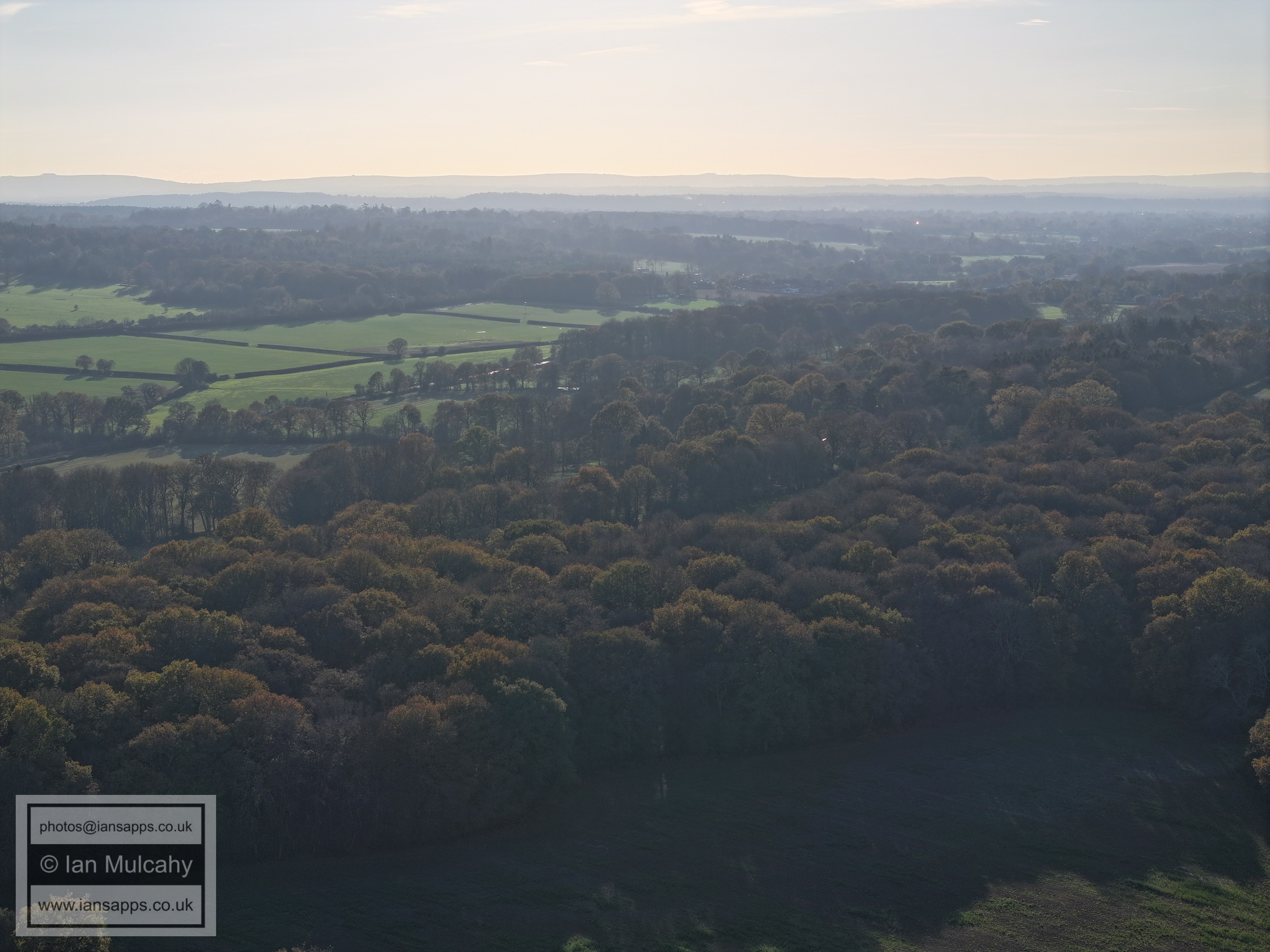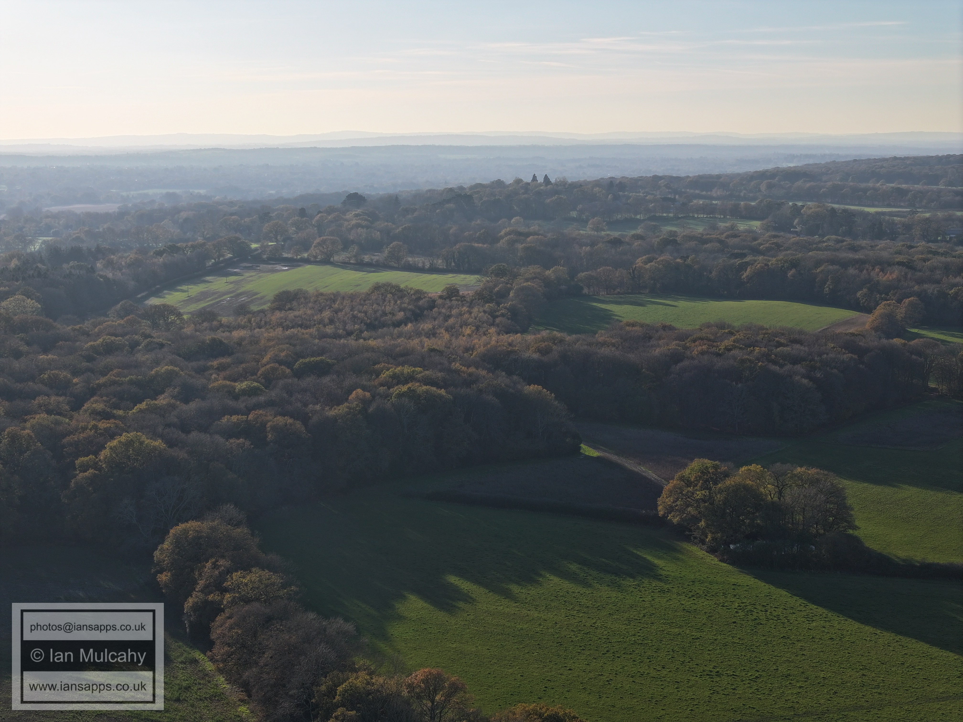 66 aerial images of varying focal length taken from fields west of Hyde Hill Woods in the Rusper, close to the boundary with Ifield, on 21 November 2025. The photos looking south are a bit hazy, but in other directions are clear views of Crawley, Gatwick & Rusper as well as across the Low Weald to the North Downs. I have annotated some of the photos.