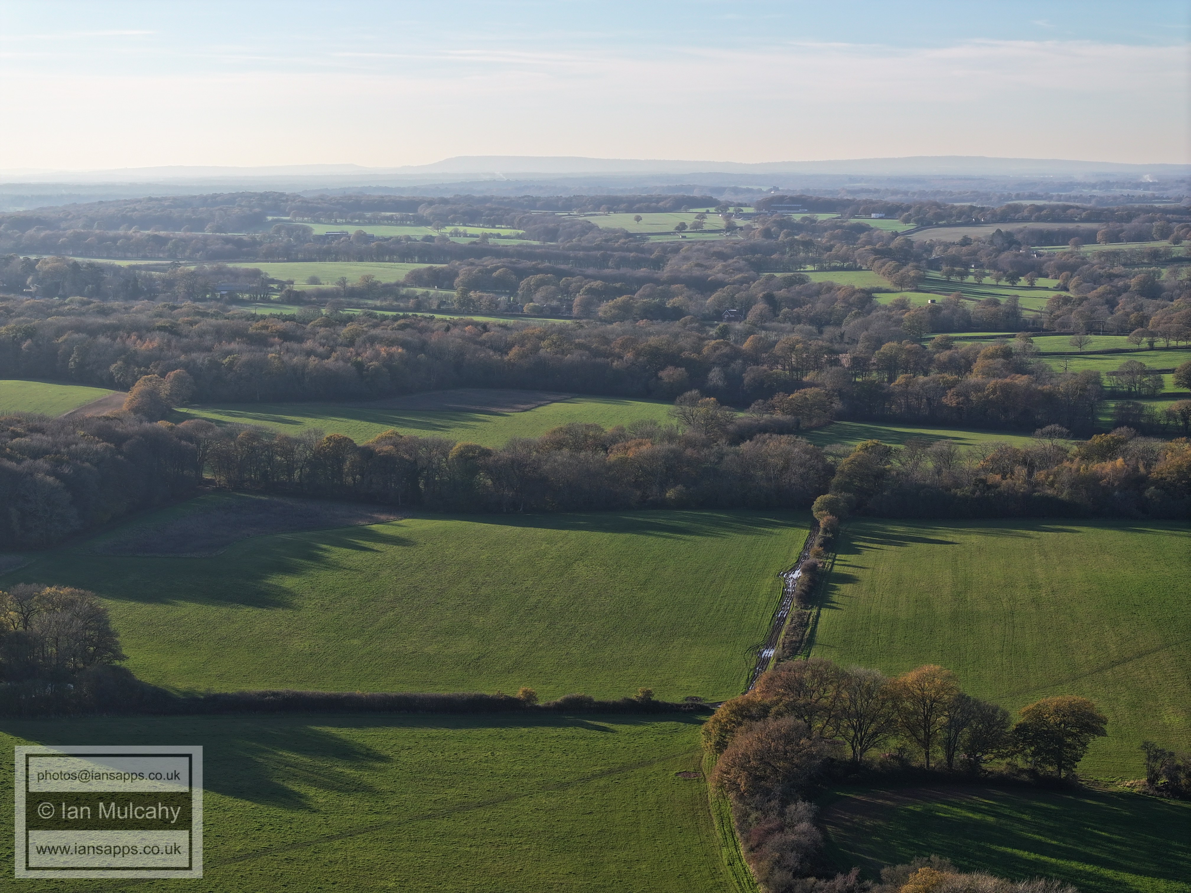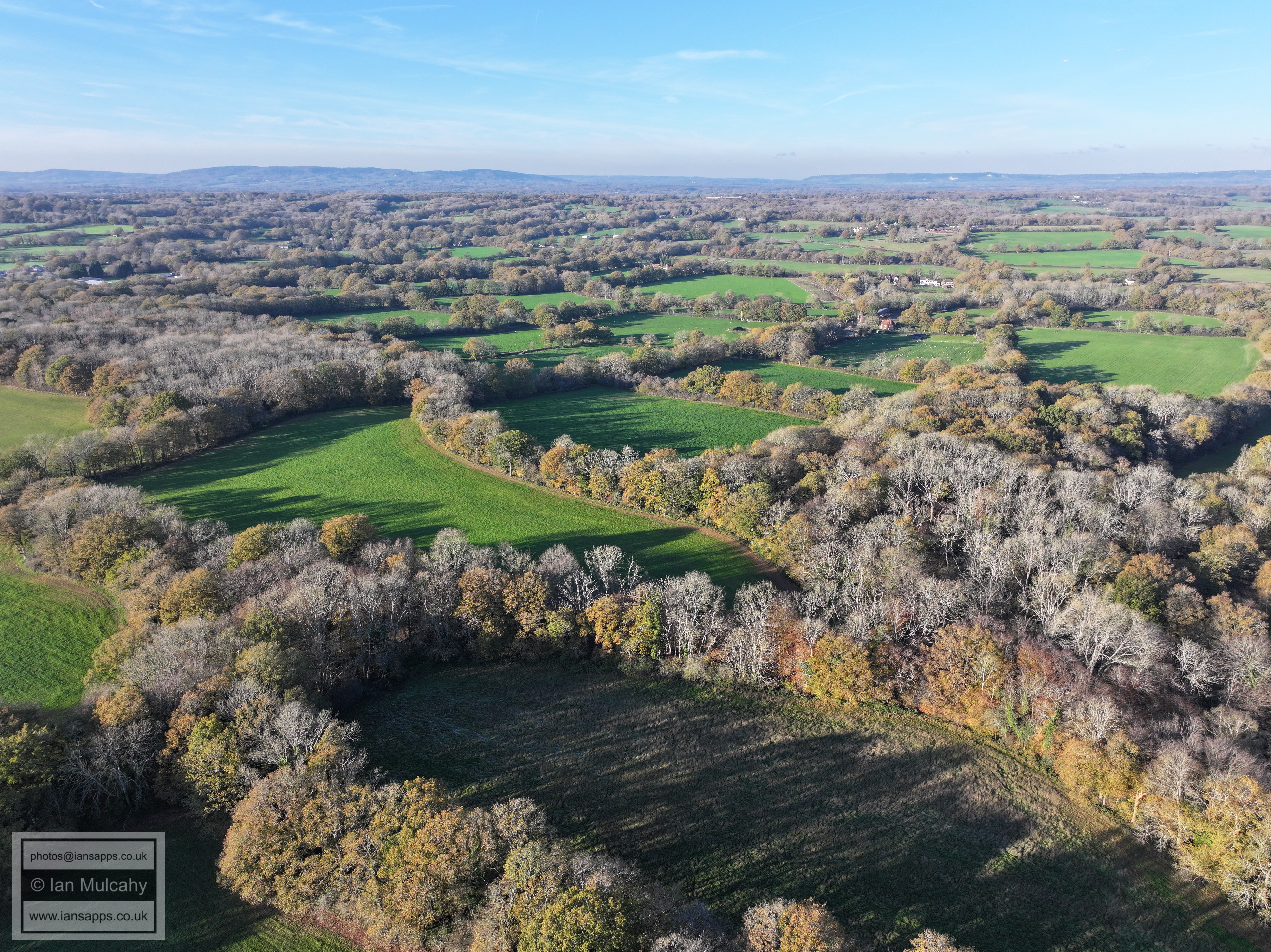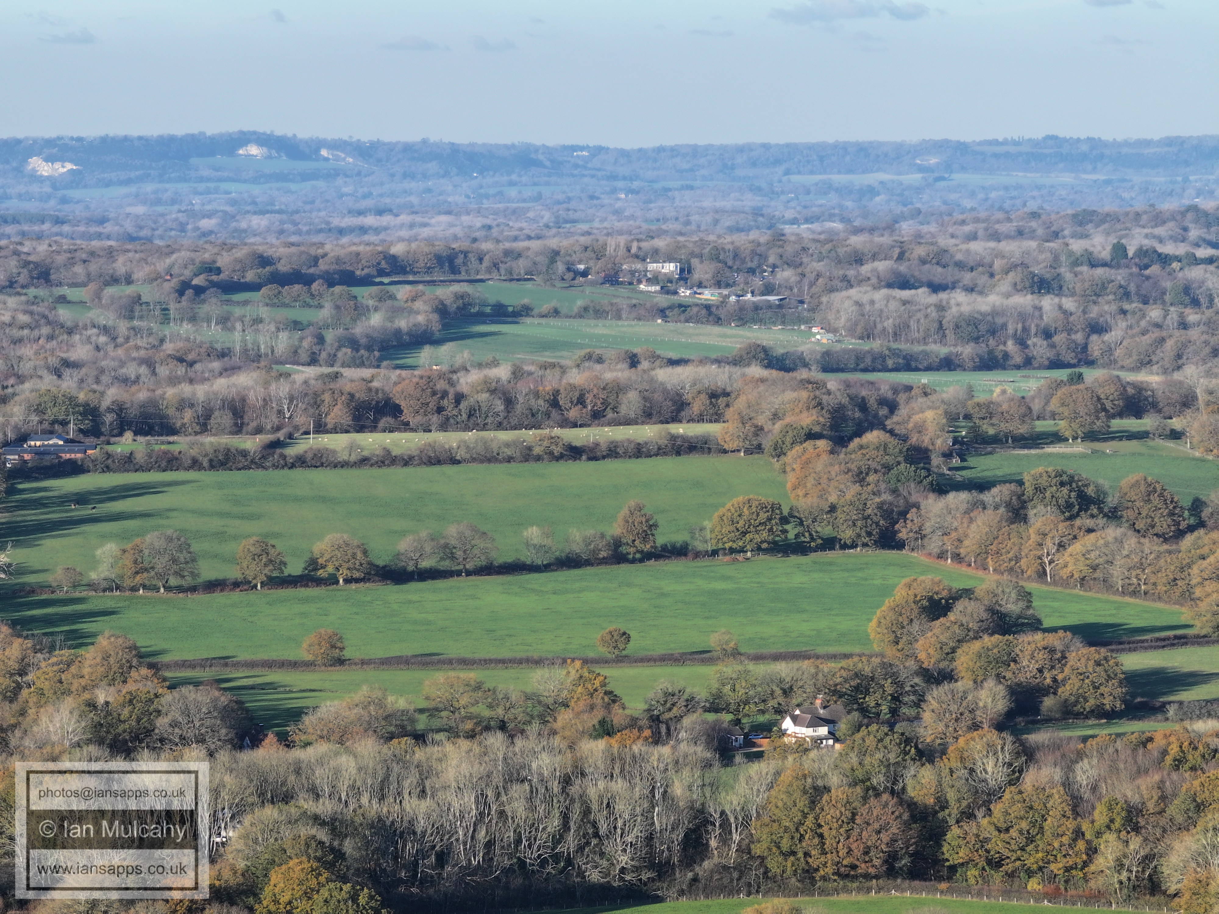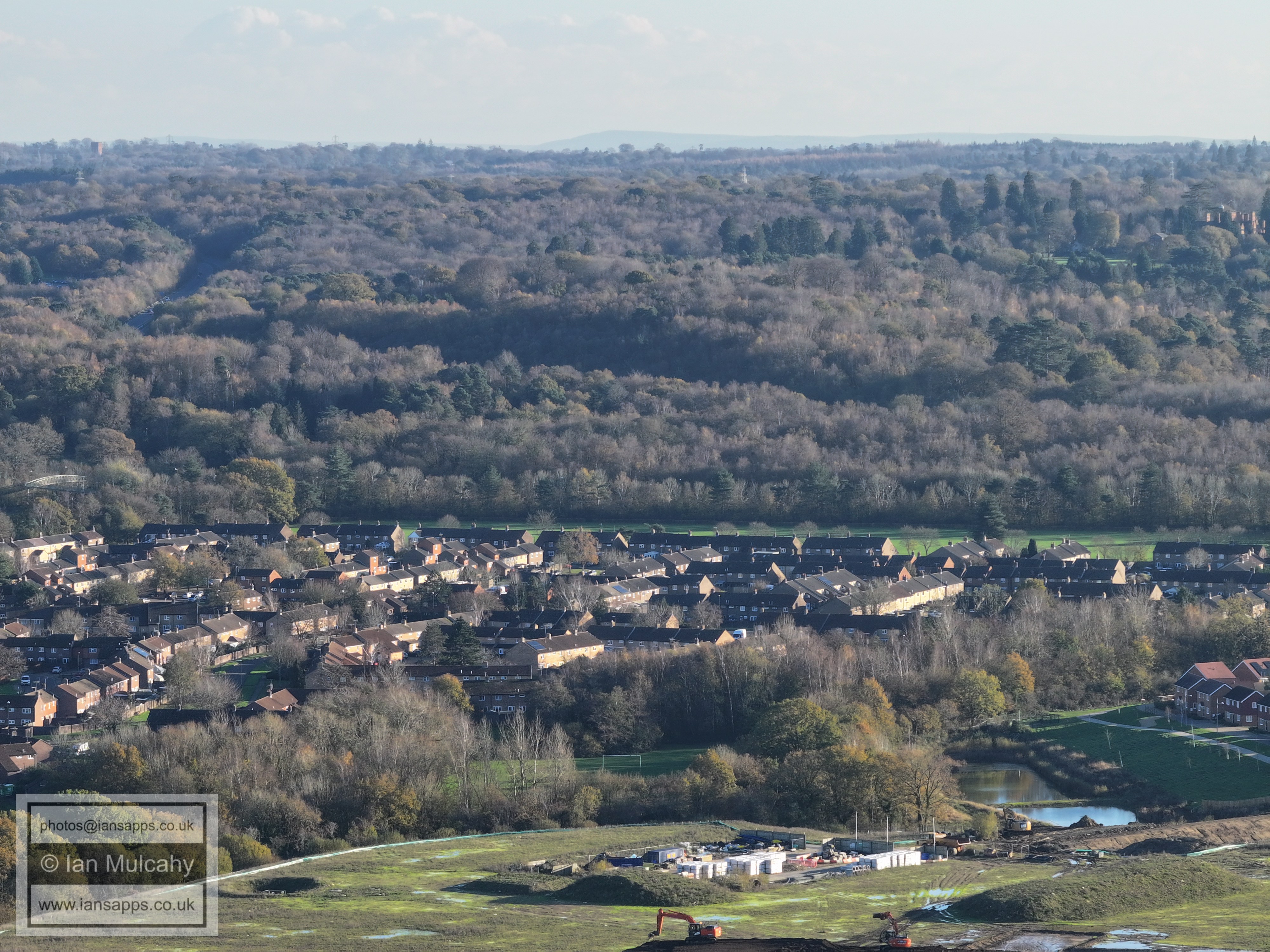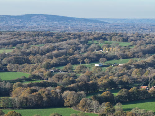 66 aerial images of varying focal length taken from fields west of Hyde Hill Woods in the Rusper, close to the boundary with Ifield, on 21 November 2025. The photos looking south are a bit hazy, but in other directions are clear views of Crawley, Gatwick & Rusper as well as across the Low Weald to the North Downs. I have annotated some of the photos.