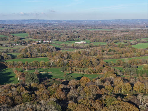 The woods across the centre are the northern sections of Furzefield and Burnt Stubbs off Kilnwood Lane. The buildings above are at Carylls Country House on Faygate Lane