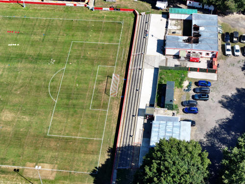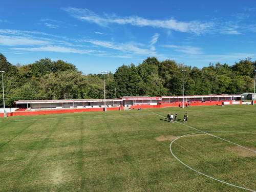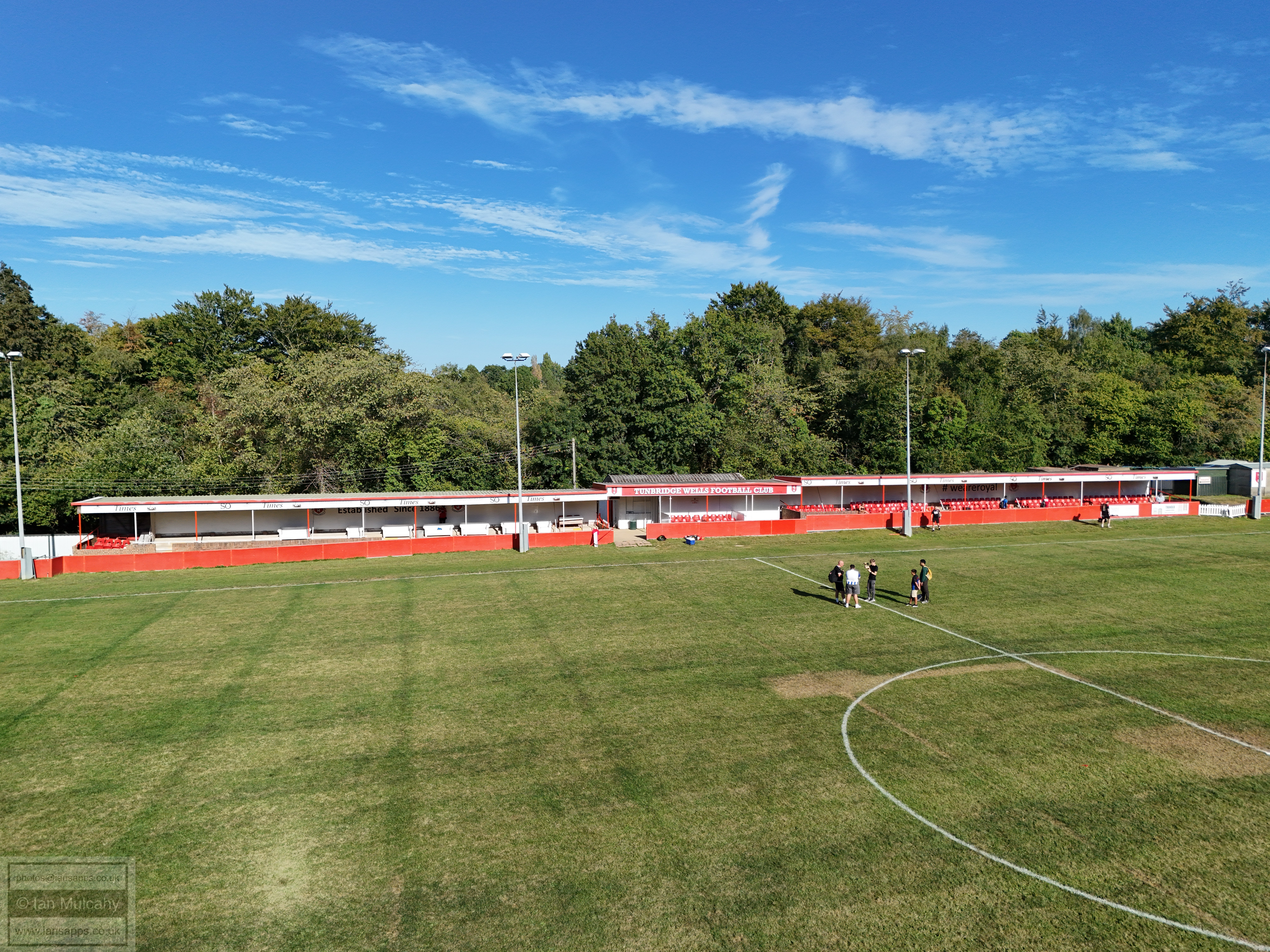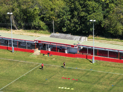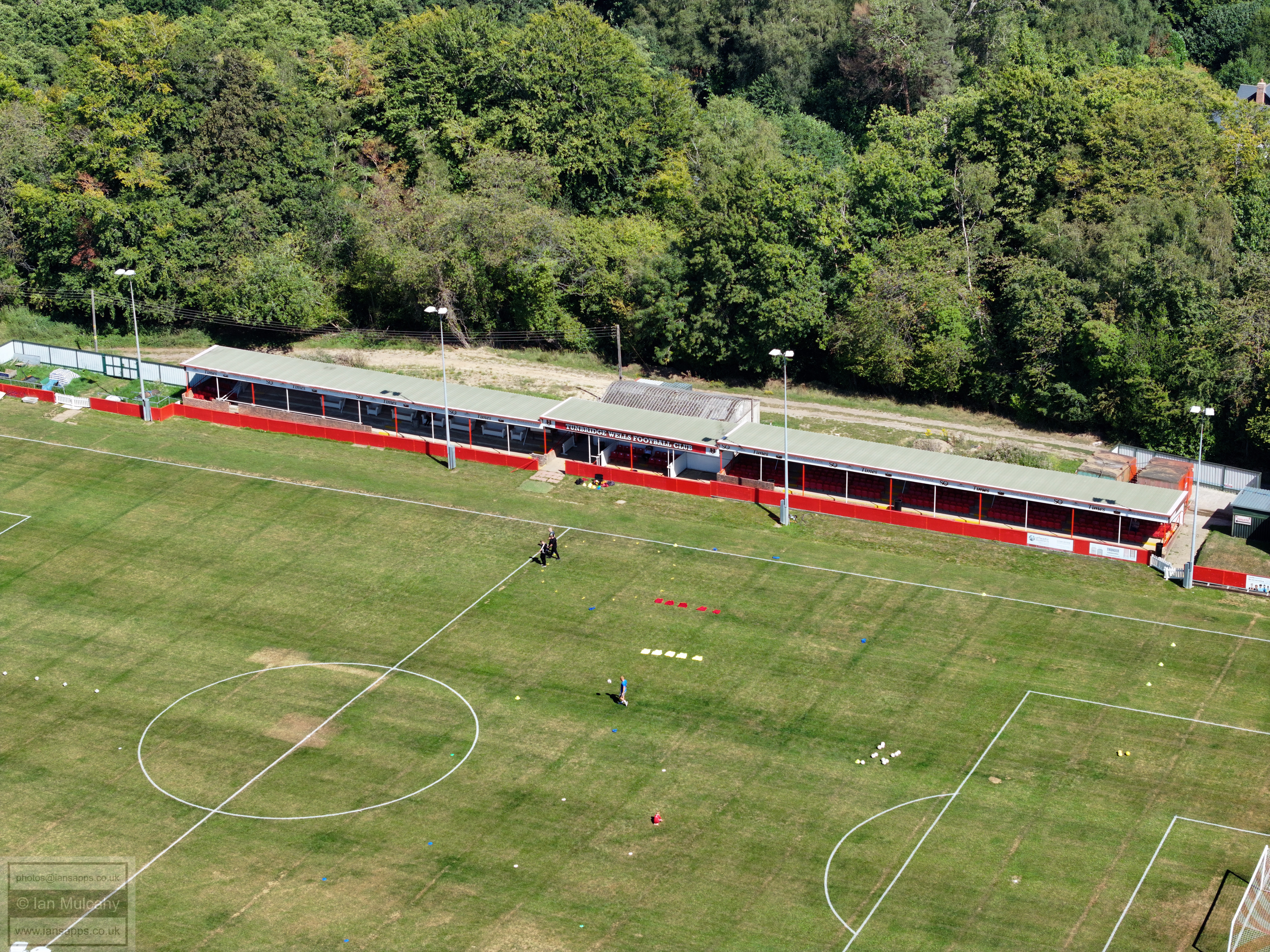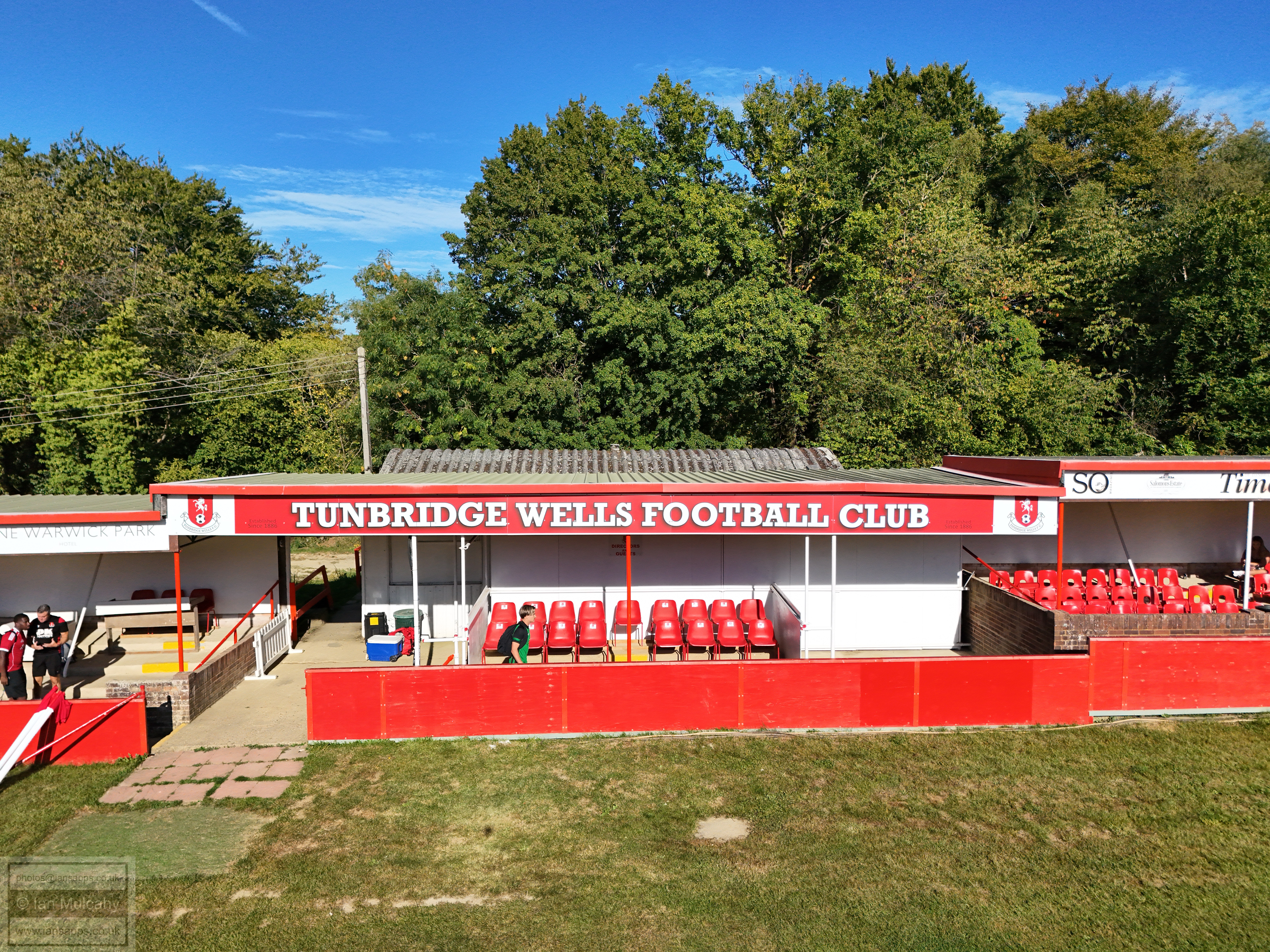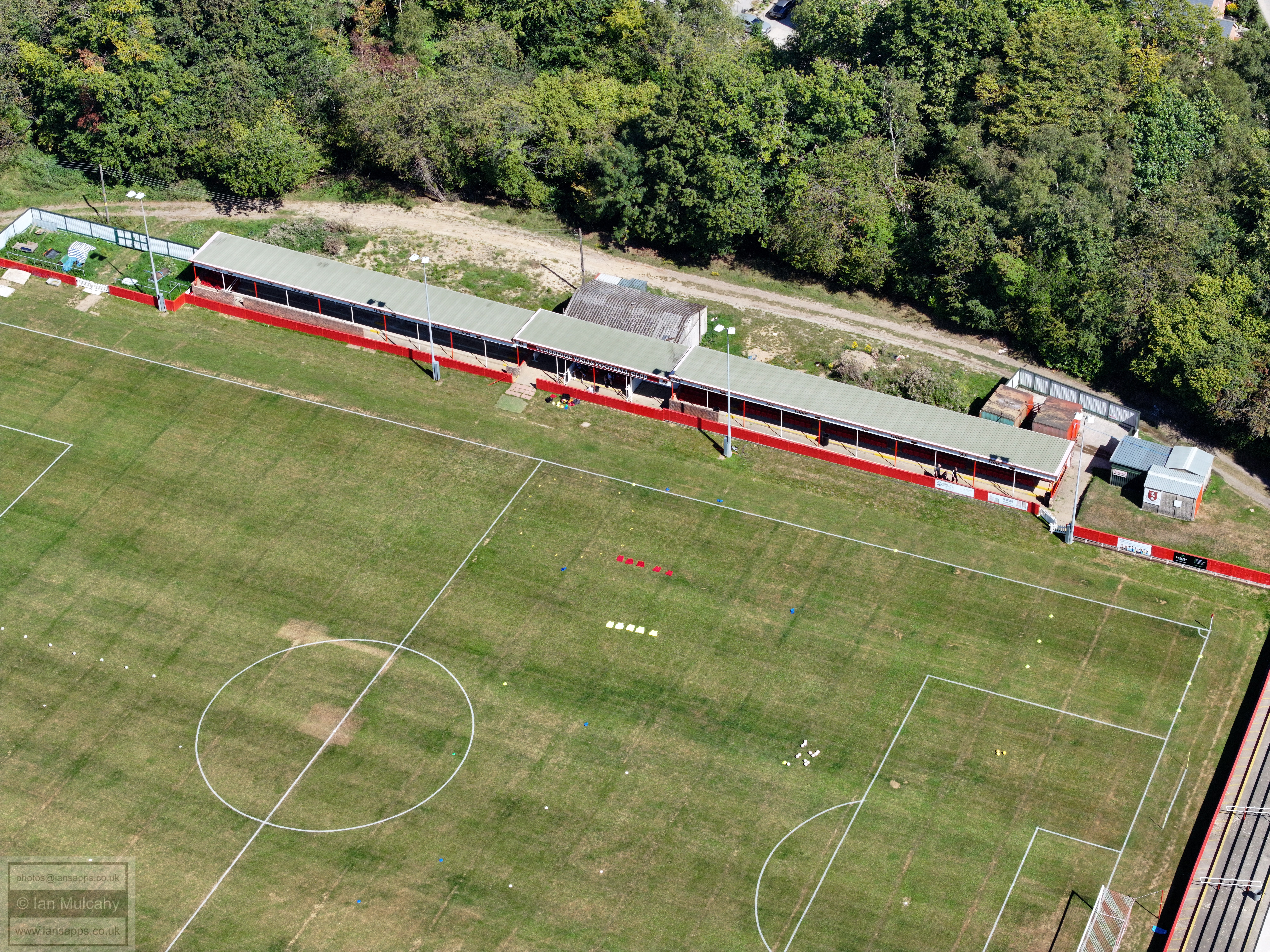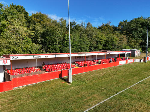 The Culverden Stadium is a proper old school ground, with a traditional stand filling almost the entire length of the pitch, a large full width terrace behind the southern goal and not a bolt together Meccano stand in sight. The western side and northern end are both flat, but have large amounts of land, giving the club the opportunity to develop their facilities. A fire started by an electrical fault in January 2023 virtually destroyed the club house and it remains out of use, which must be a financial hit to the club. The collapsed roof can be seen on some of the aerial images.