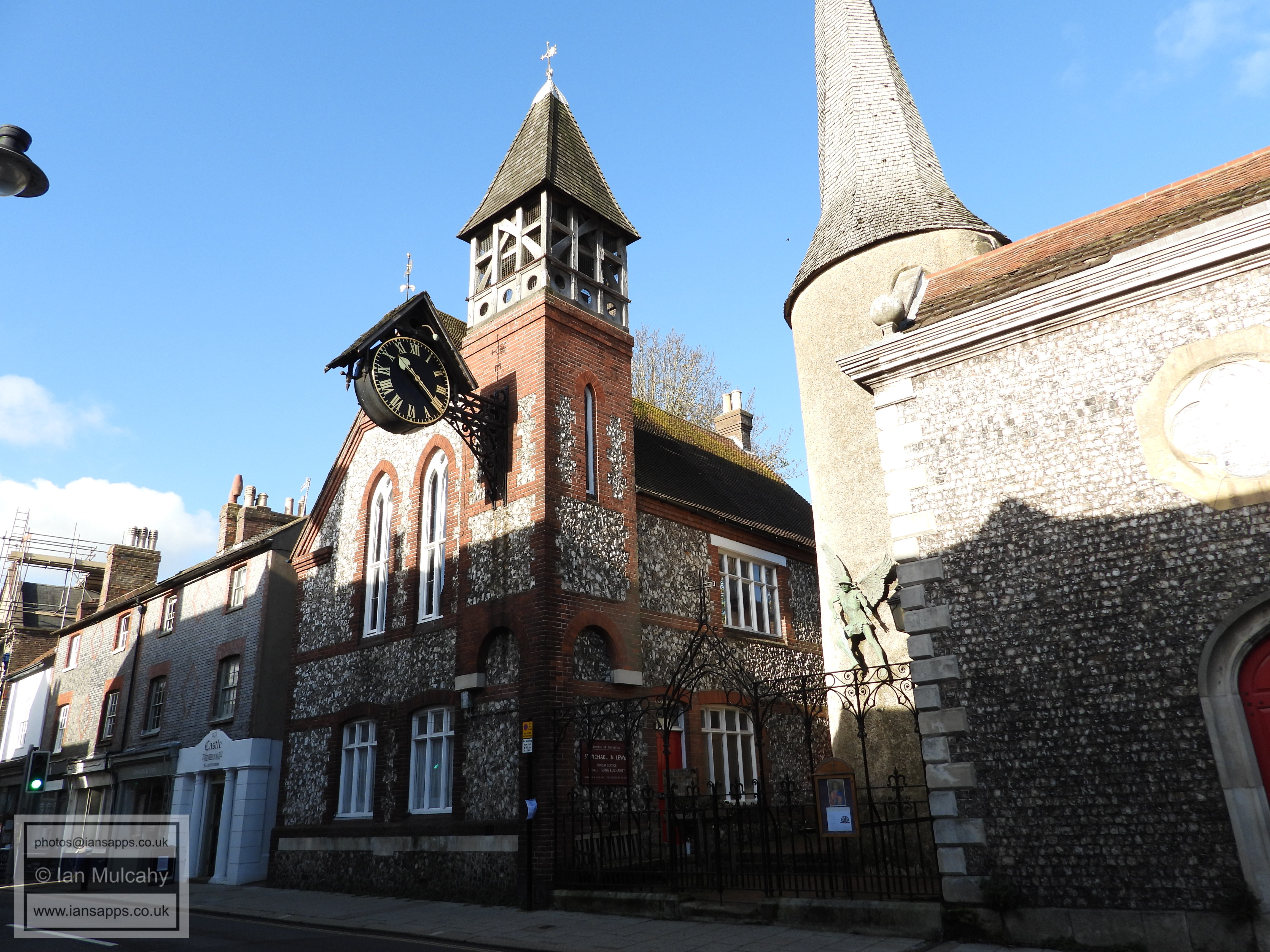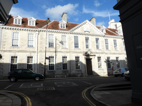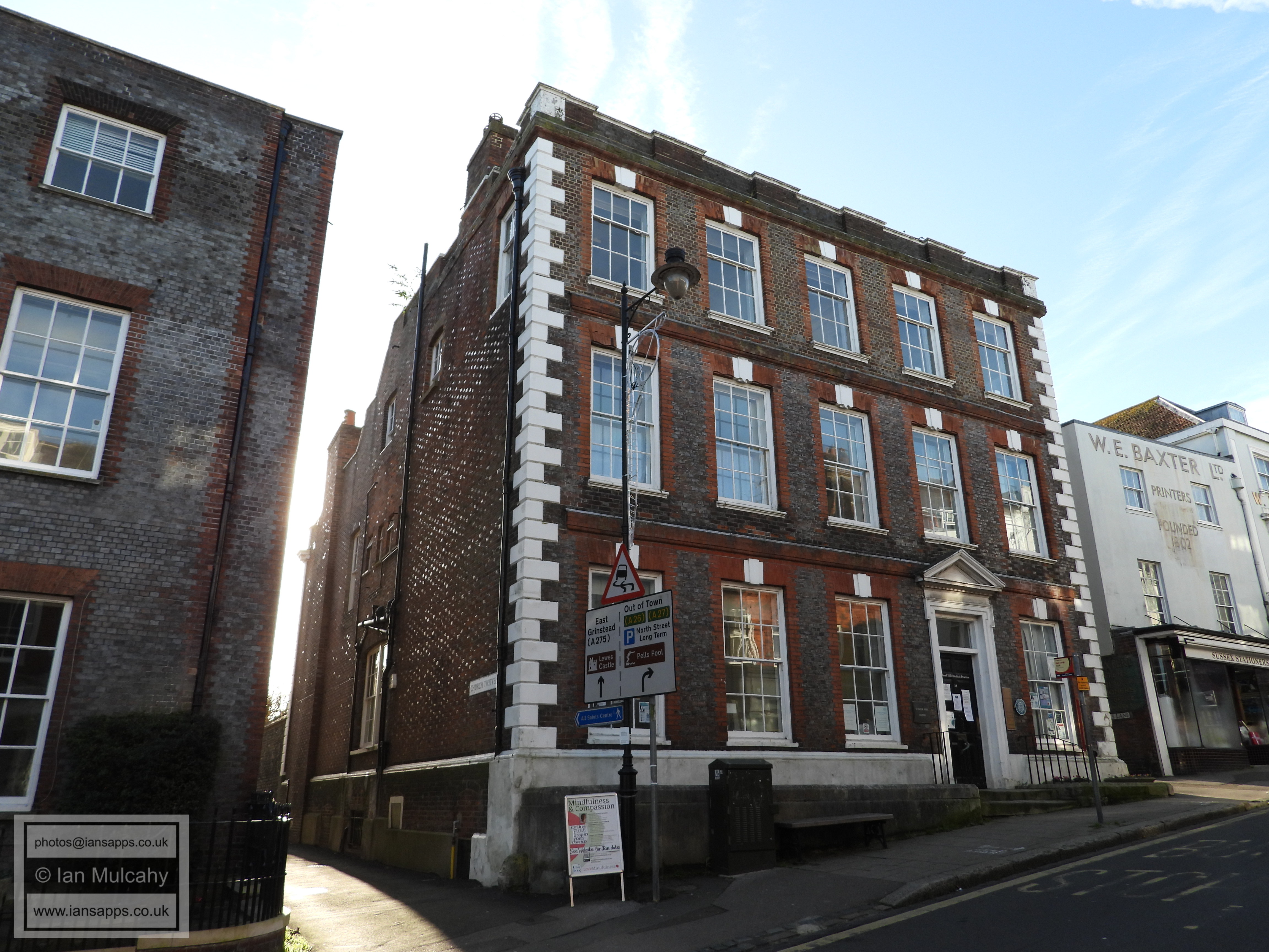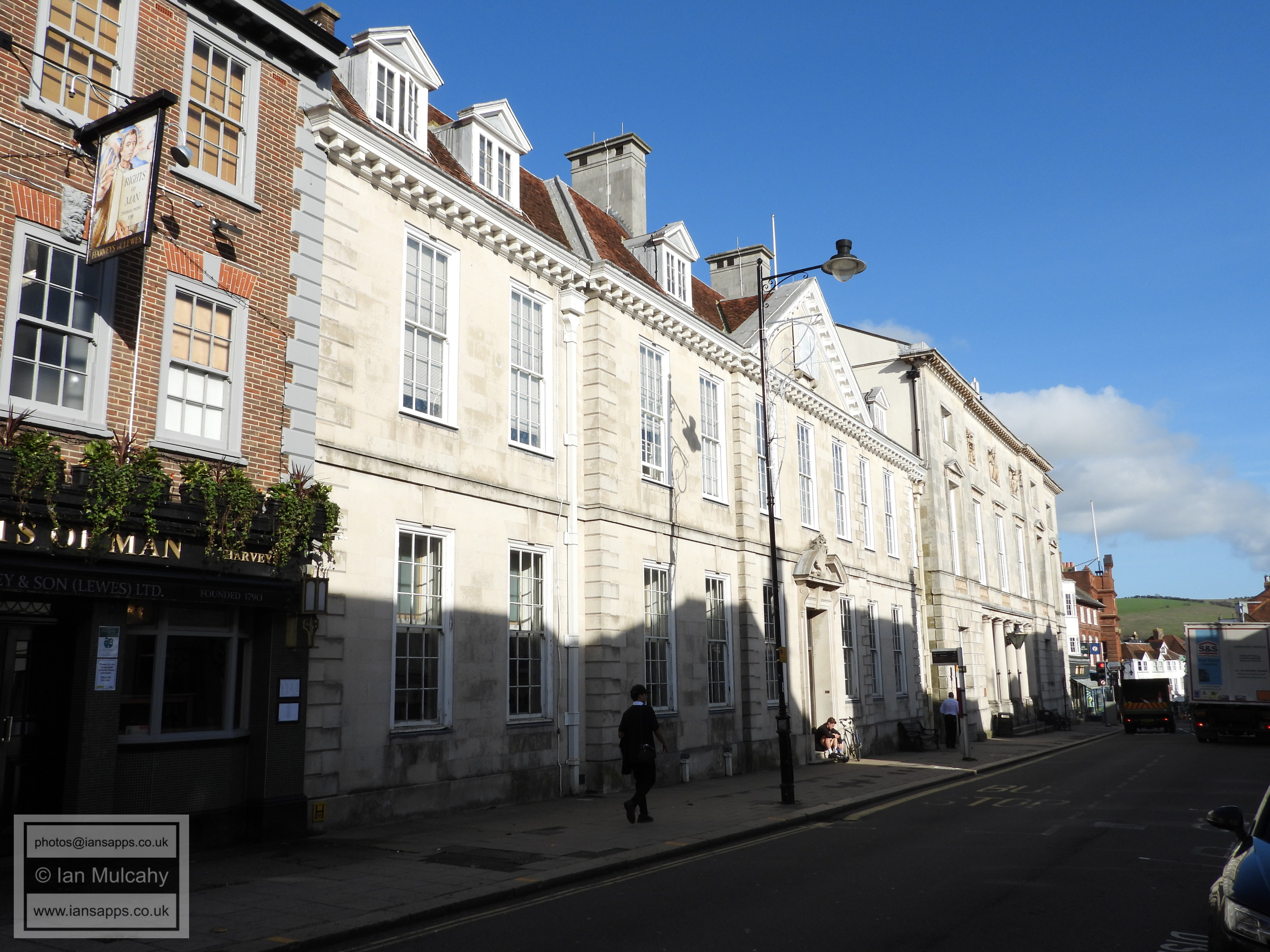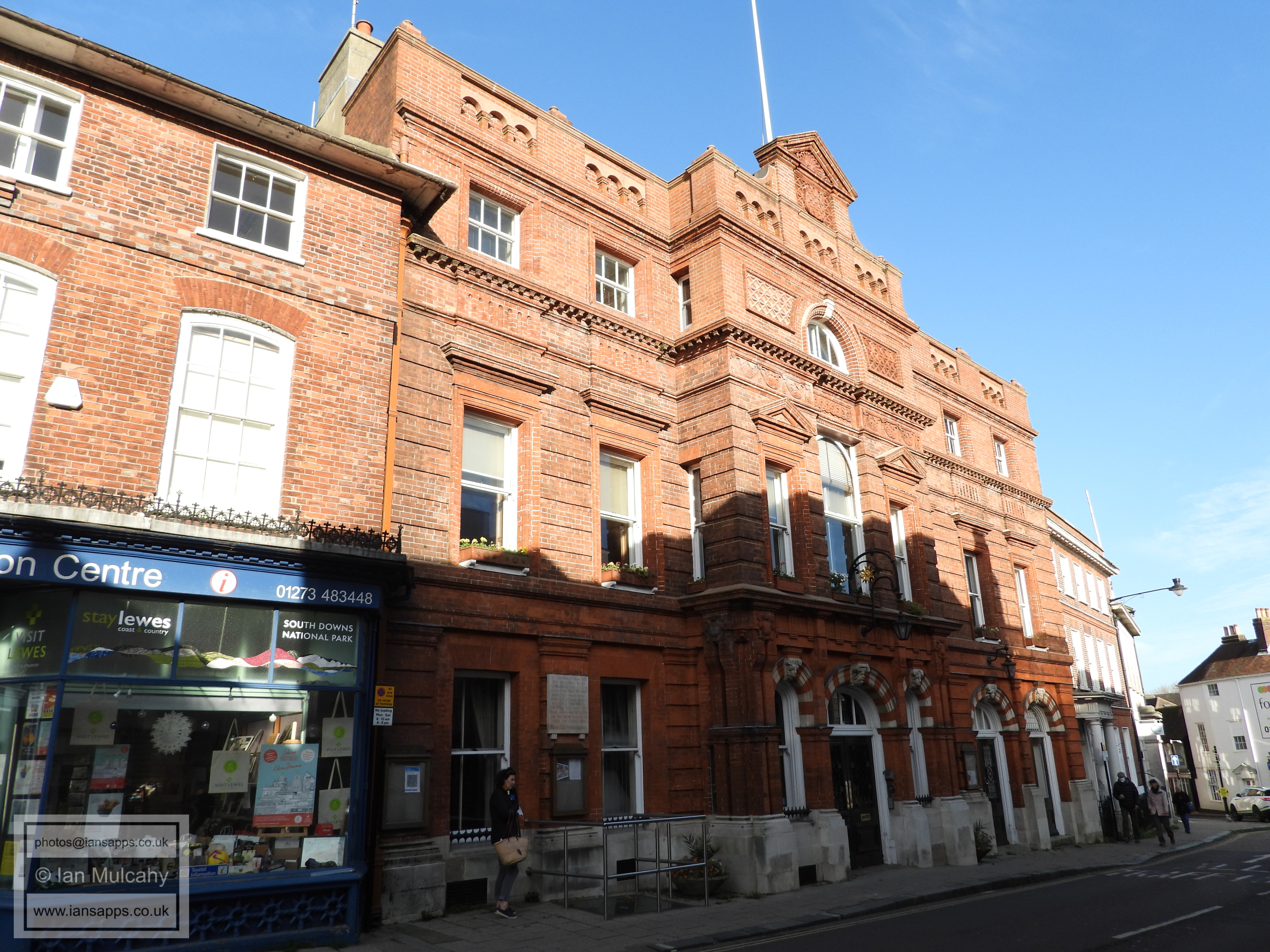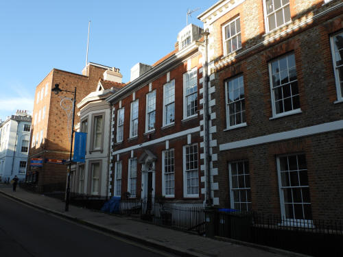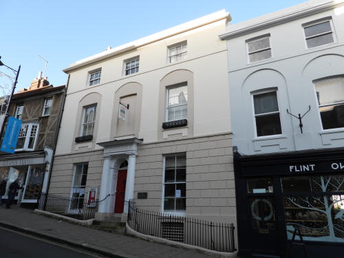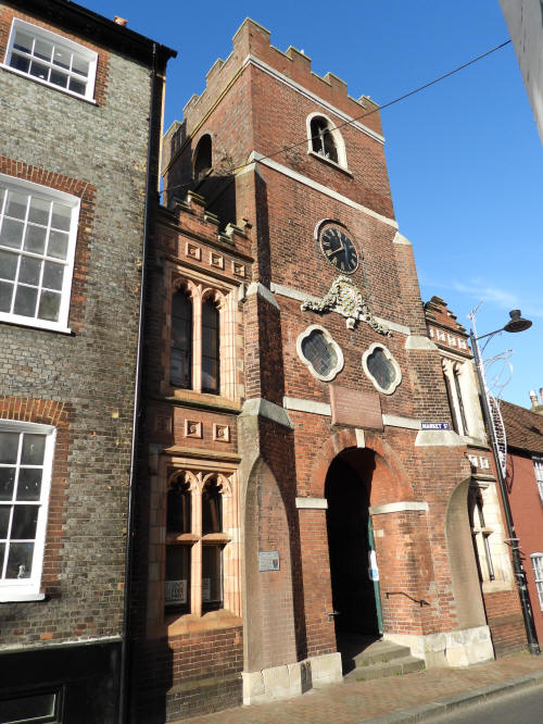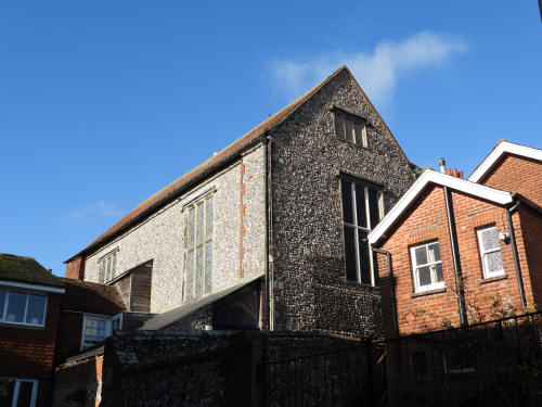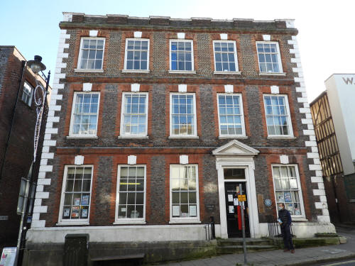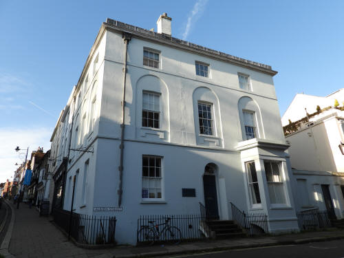 Lewes Town Hall (189 High Street, behind, left). Grade 2 listed building. C14, rebuilt above ground late C18, remodeled 1883