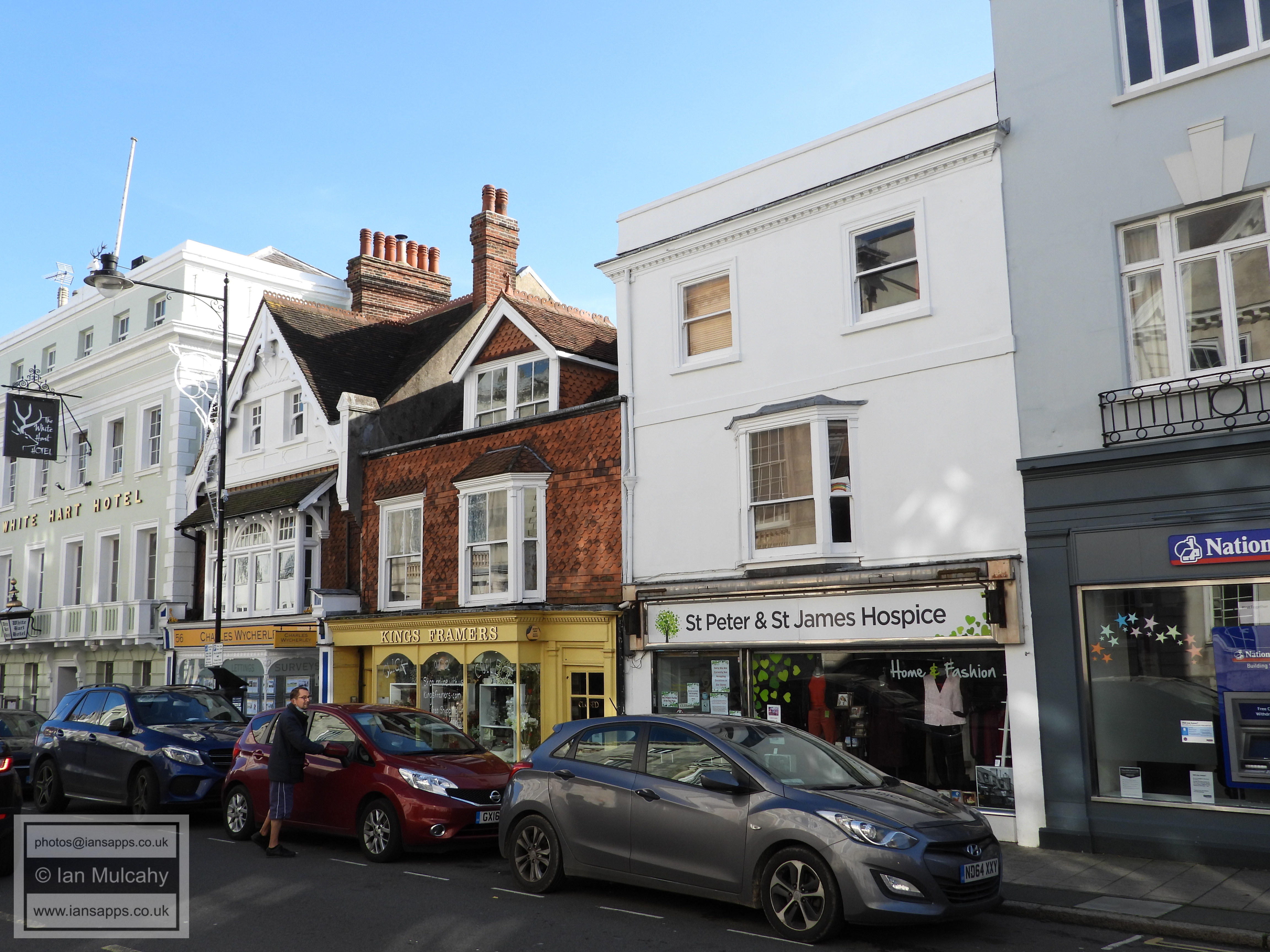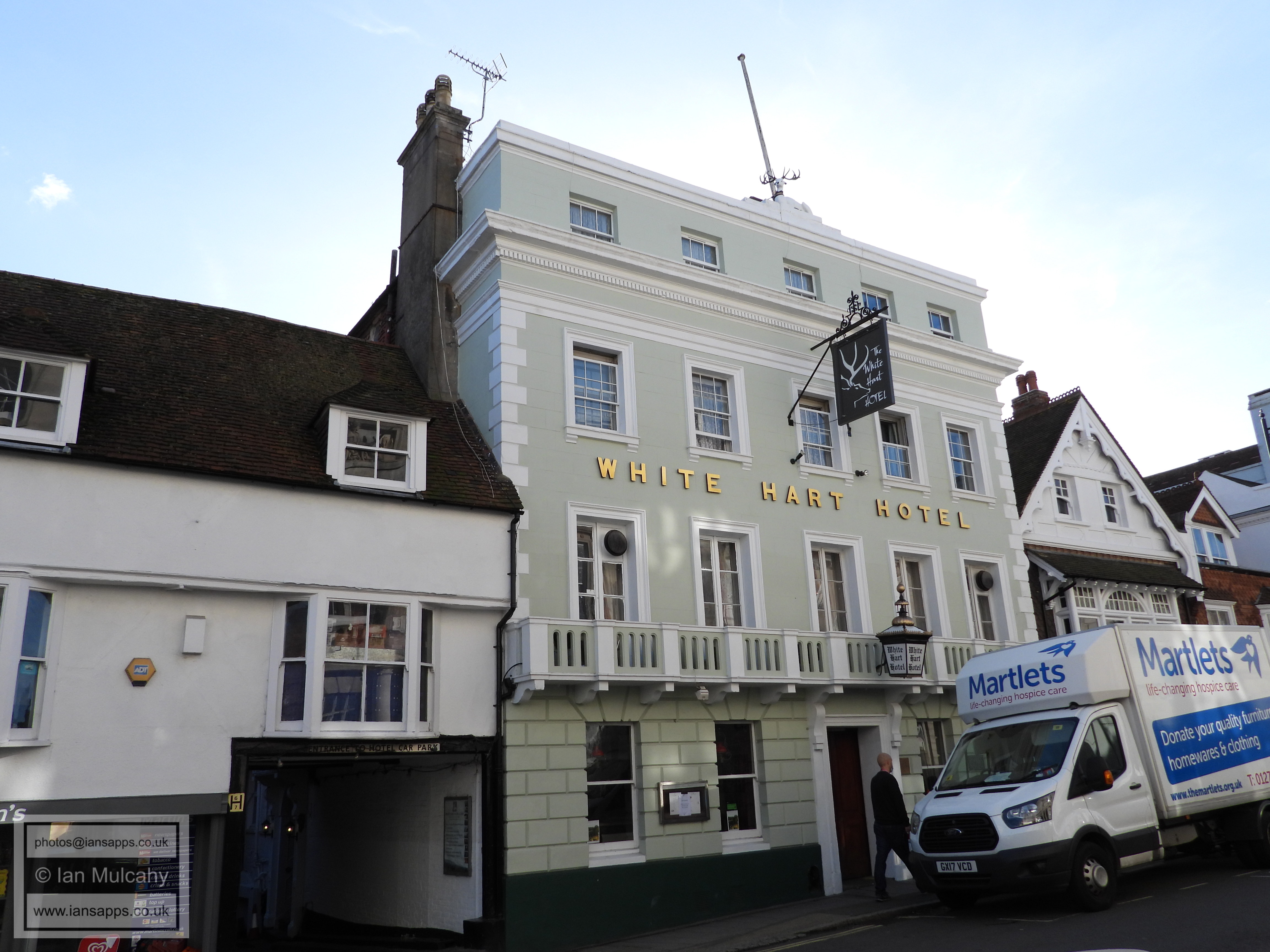 51 & 52 High Street (left). Grade 2 listed building. C16. Refronted in C18 53 & 54 High Street (centre left). Grade 2 listed building. C15 and Late C16 or early C17 White Hart Hotel (55 High Street, centre right). Grade 2 listed building. C16 or earlier, refronted early to mid C19