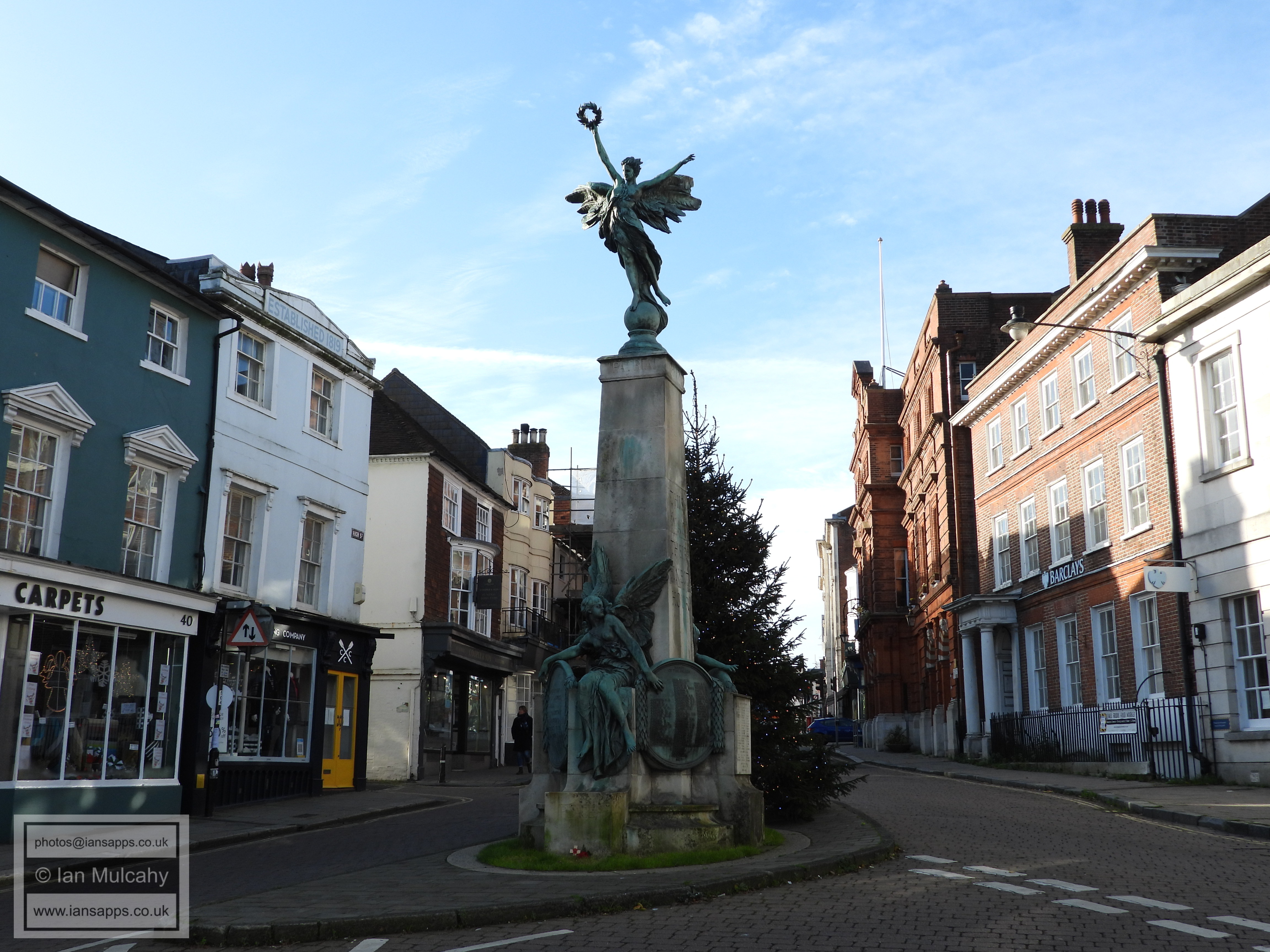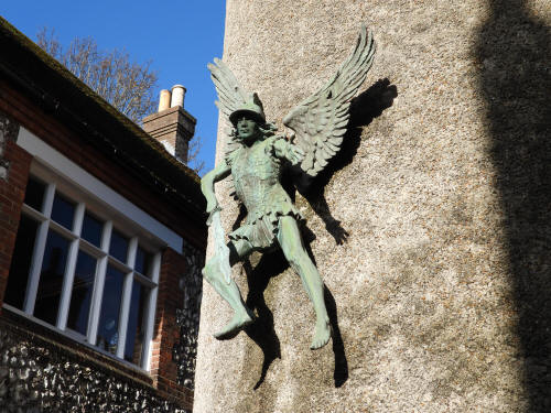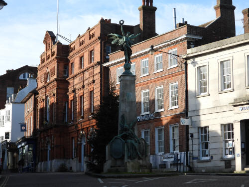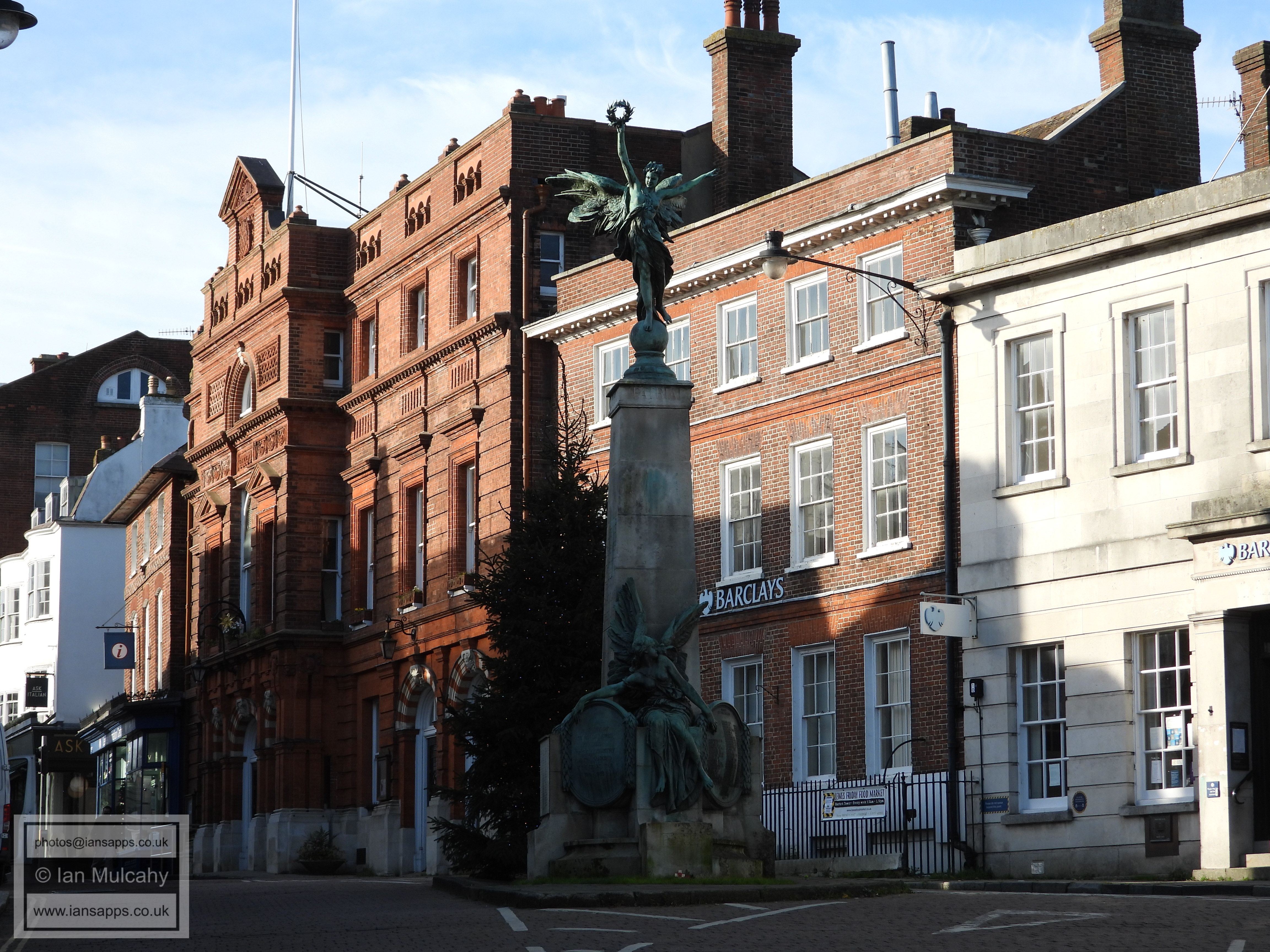 War Memorial (High Street, centre). Grade 2* listed building. 1922 Lewes Town Hall (189 High Street, behind, left). Grade 2 listed building. C14, rebuilt above ground late C18, remodeled 1883 Old Bank House (190 High Street, behind, right). Grade 2 listed building. Mid C18, early C19 alterations