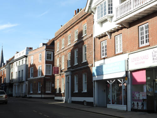 11 High Street (left end of block). Grade 2 listed building. 1770 13/13A High Street (2nd left). Grade 2 listed building. Early C19 14 High Street (centre). Grade 2 listed building. Early C18